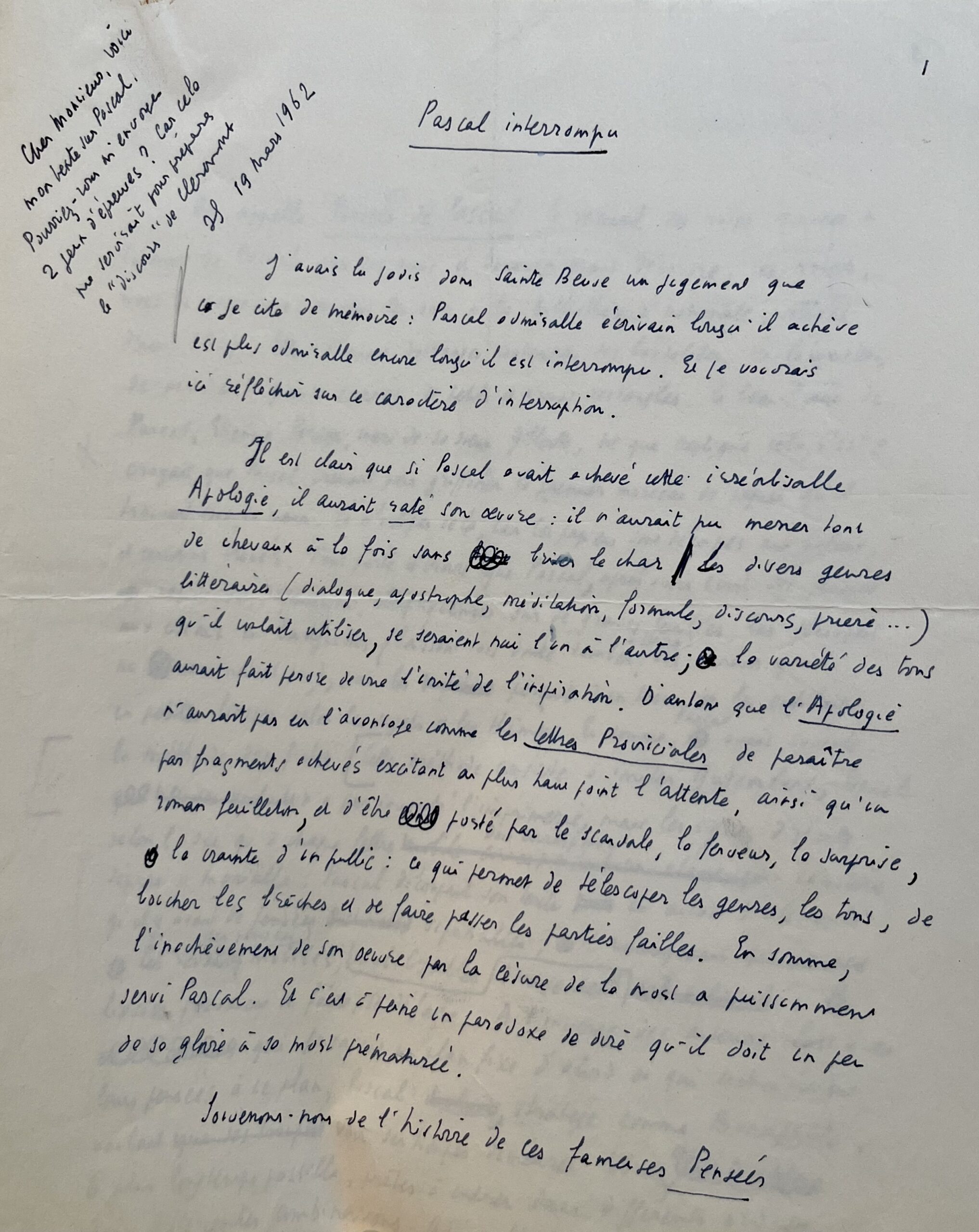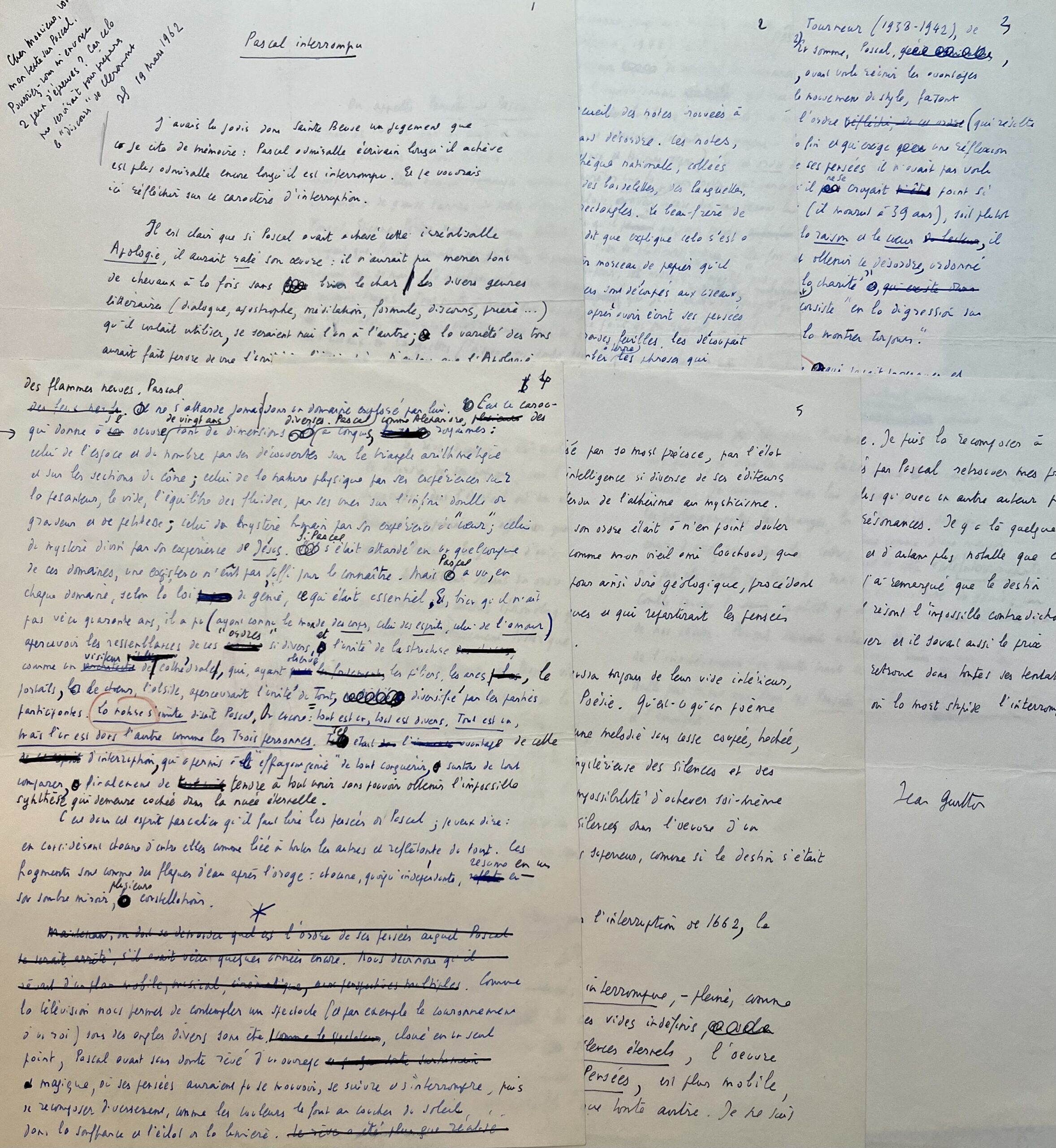 Manuscrit de travail de Jean Guitton, intitulé « Pascal interrompu ». Texte publié dans la revue littéraire "Livres de France", n°5, en mai 1962, numéro consacré à Pascal.
