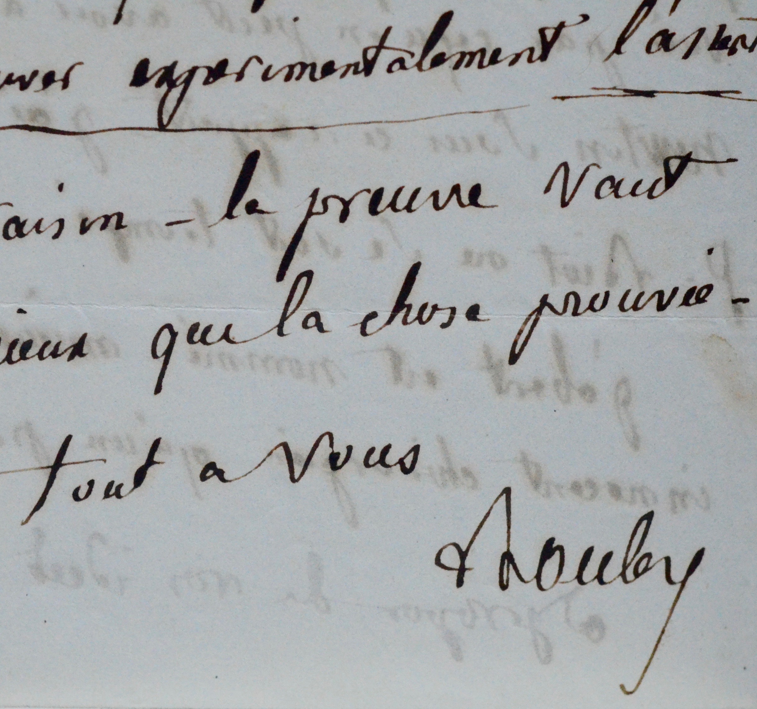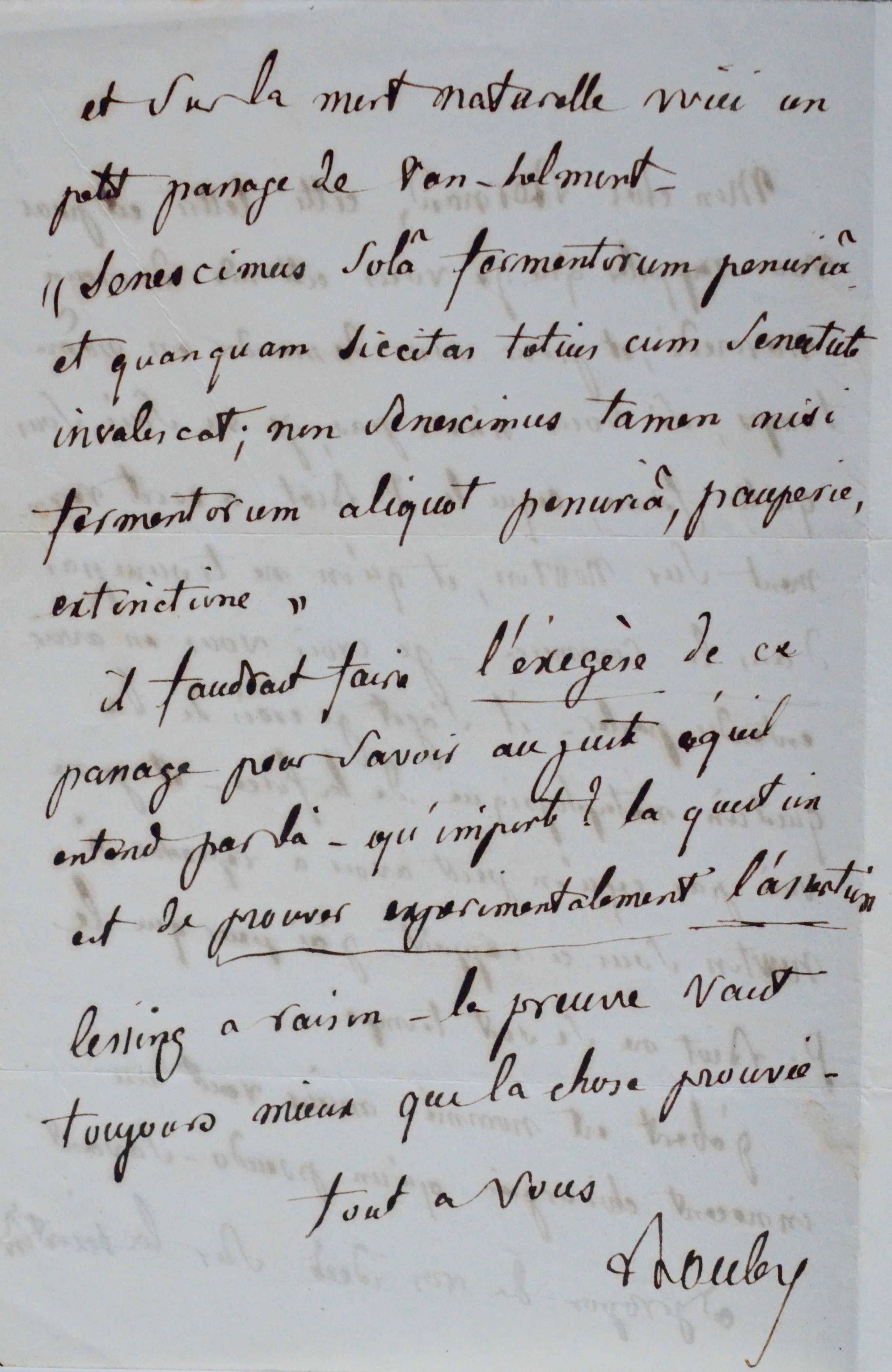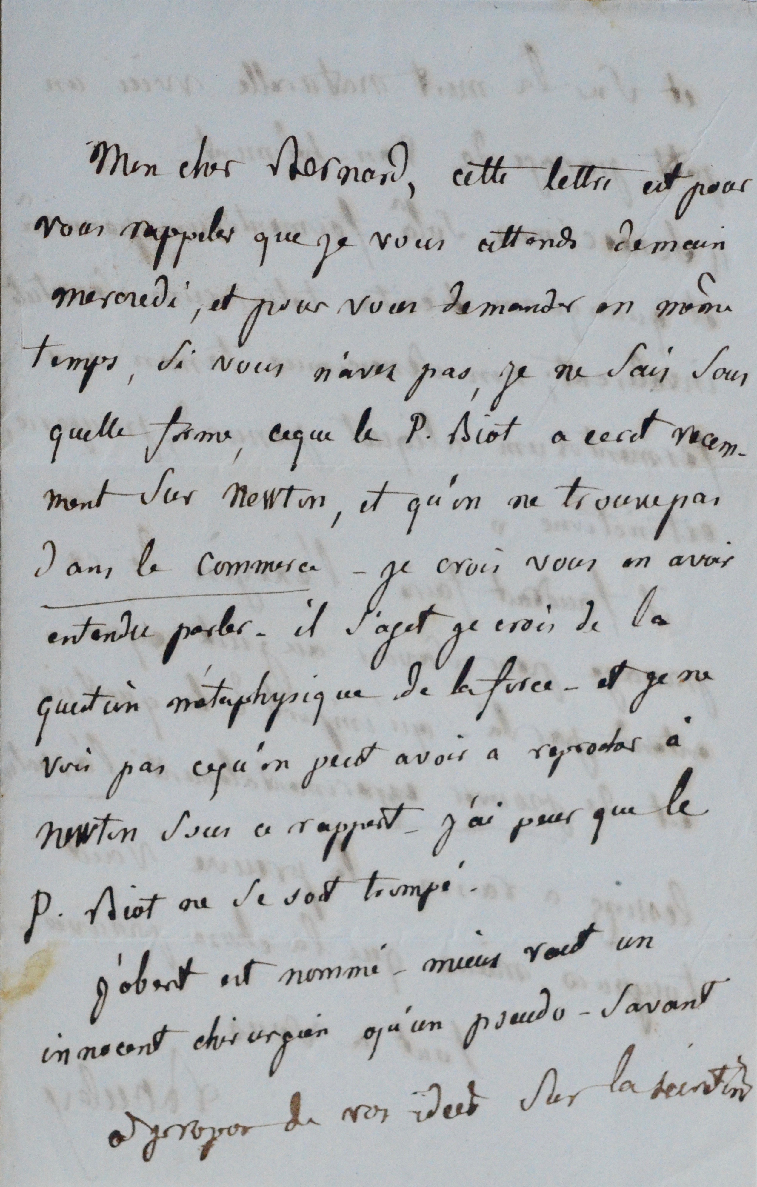 À propos de Newton. "Cette lettre est pour vous rappeler que je vous attends demain mercredi, et pour vous demander en même temps, si vous n'avez pas, je ne sais sous quelle forme, ce que le P. Biot a écrit récemment sur Newton, et qu'on ne trouve pas dans le commerce. Je crois vous en avoir entendu parler. Il s'agit, je crois, de la question métaphysique de la force - et je ne vois pas ce qu'on peut avoir à reprocher à Newton sous ce rapport. J'ai peur que le P. Biot ne se soit trompé. Jobert est nommé [probablement le chirurgien et gynécologue Antoine-Joseph Jobert (1799-1867)] - mieux vaut un innocent chirurgien qu'un pseudo savant [...]". Bouley disserte ensuite sur les idées de Claude Bernard relatives à la mort naturelle, site un texte latin et ajoute "Il faudrait faire l'exégèse de ce passage pour savoir au juste ce qu'il entend par là - qu'importe ! la question est de prouver expérimentalement l'assertion. Lessing a raison - la preuve vaut toujours mieux que la chose prouvée […]".