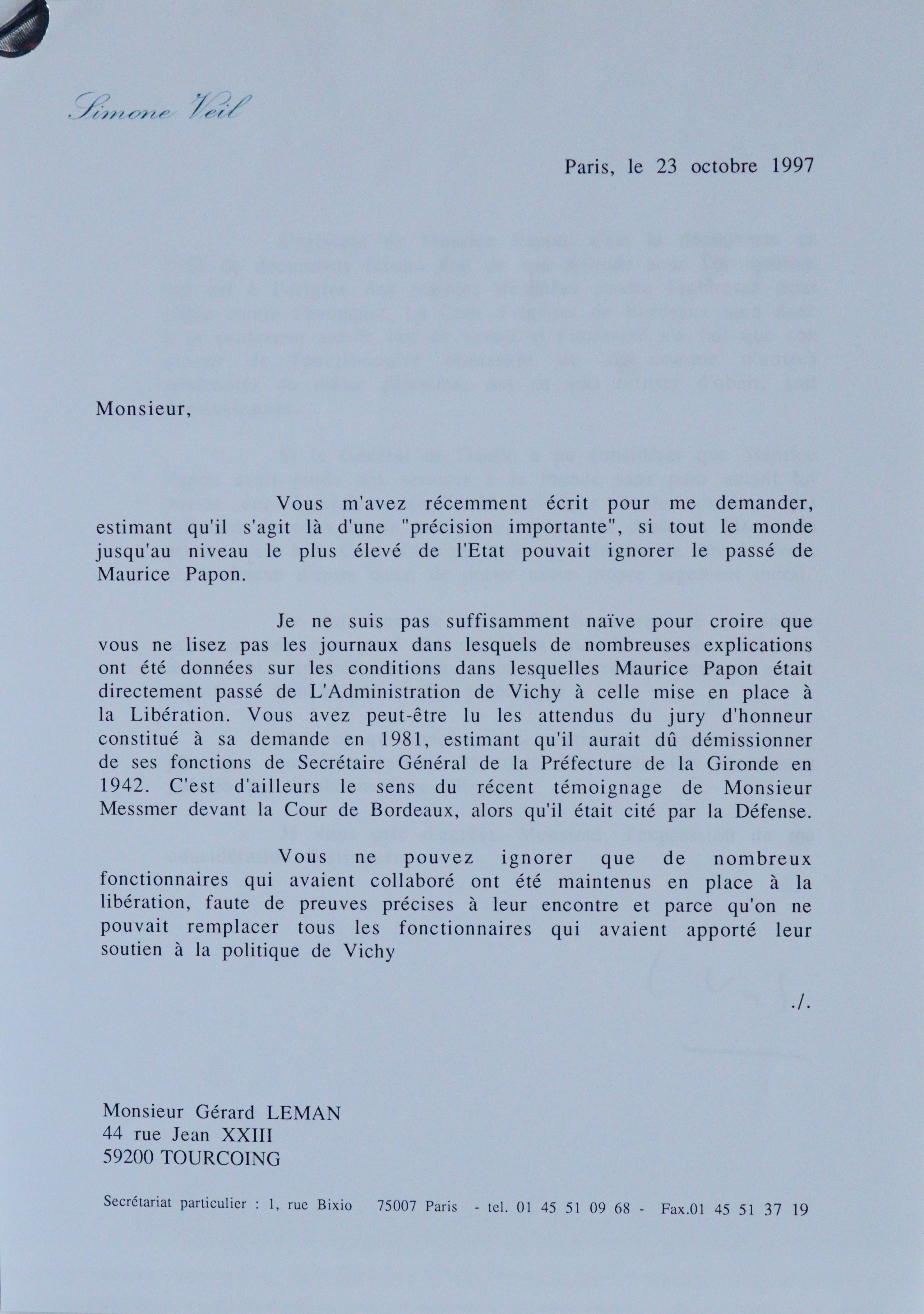 Intéressante lettre de Simone Veil sur le procès de Maurice Papon