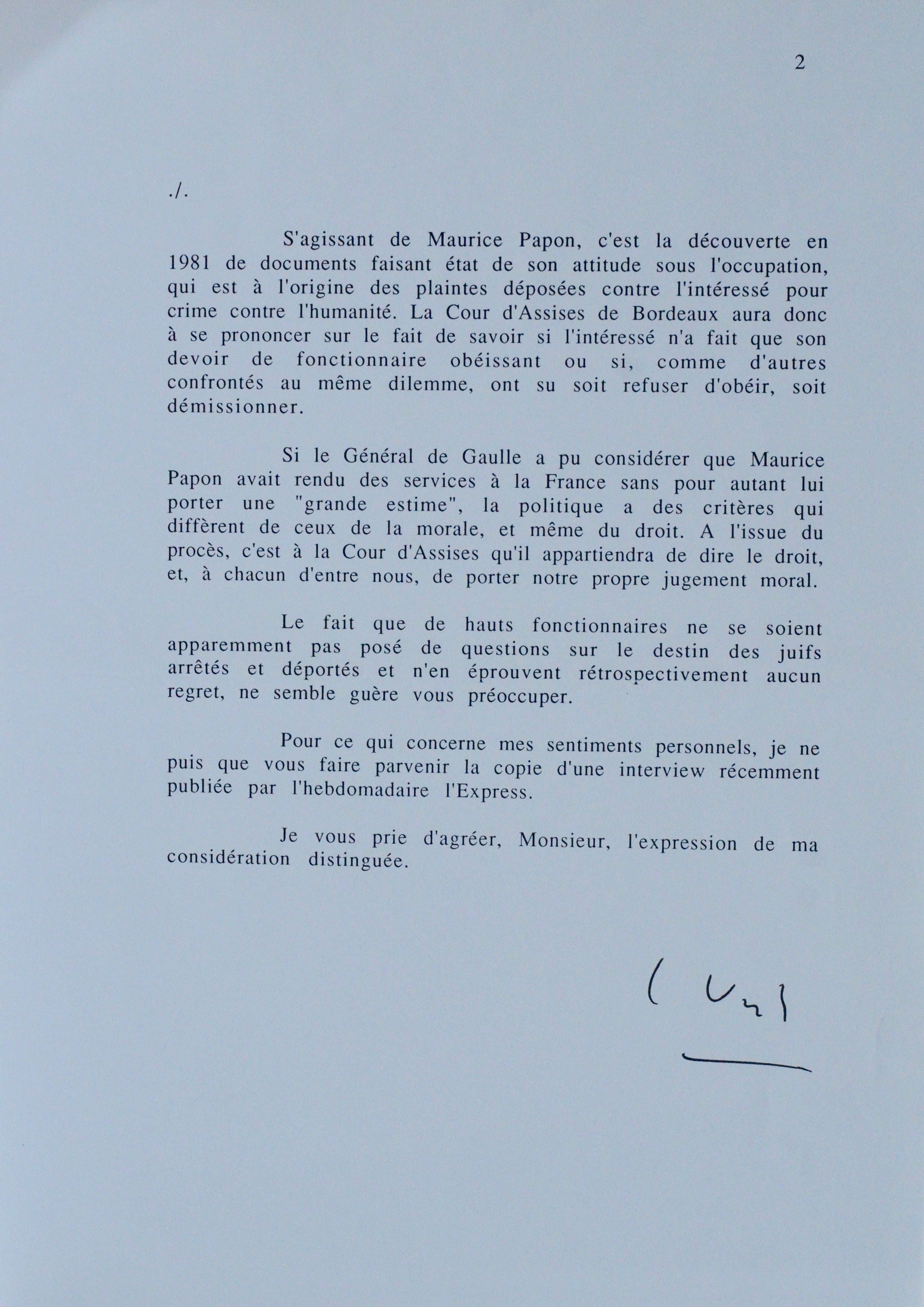 "Vous m'avez récemment écrit pour me demander, estimant qu'il s'agit là d'une "précision importante", si tout le monde jusqu'au niveau le plus élevé de l'État, pouvait ignorer le passé de Maurice Papon.