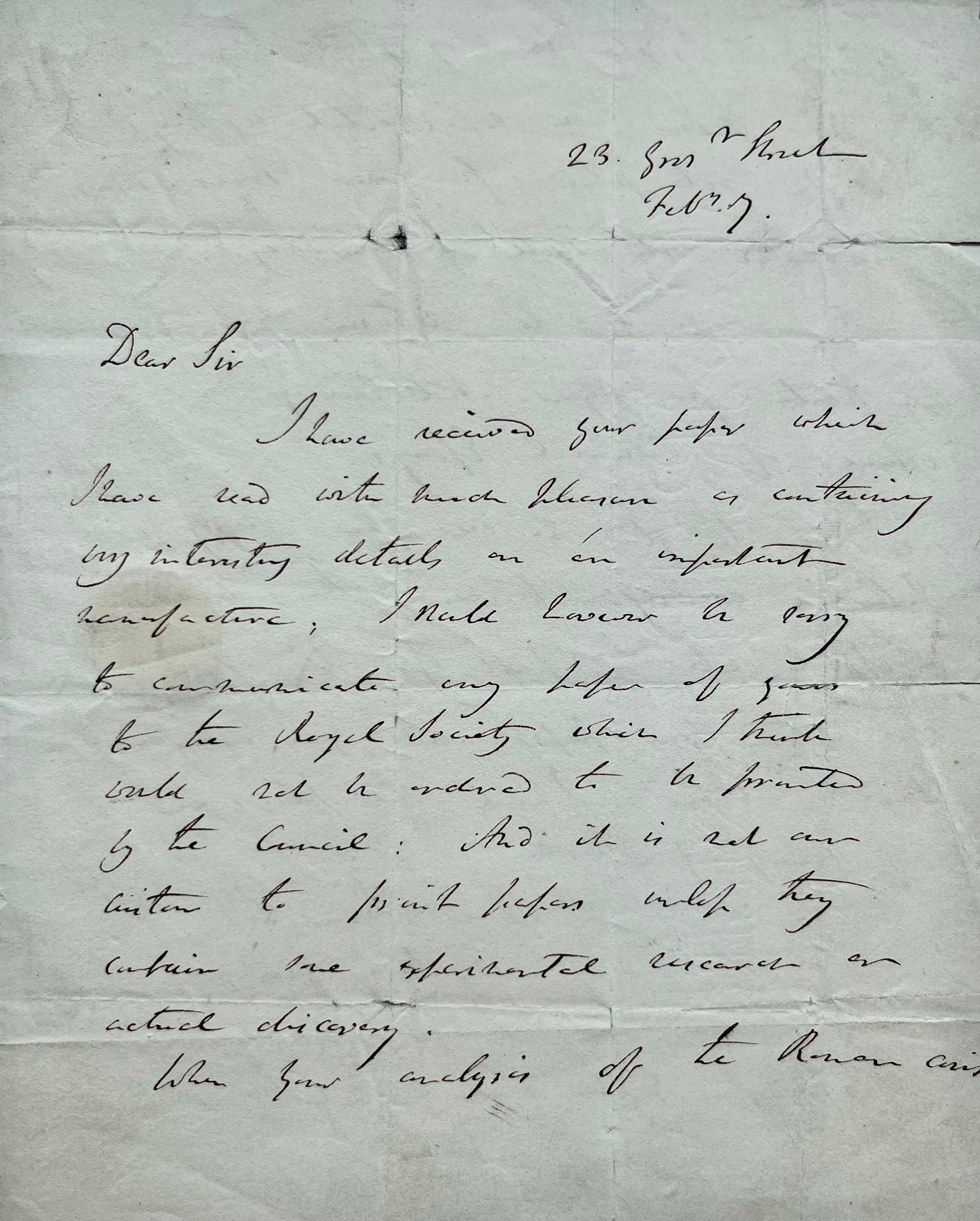 "I have received your paper which I have read with much pleasure it containing very interesting details on an important manufacture ; I would however be happy to communicate any paper of yours to the Royal Society which I think would not be ordered to be presented by the council : and it is not our (?) to present papers unless they contain some experimental research or actuel discovery.