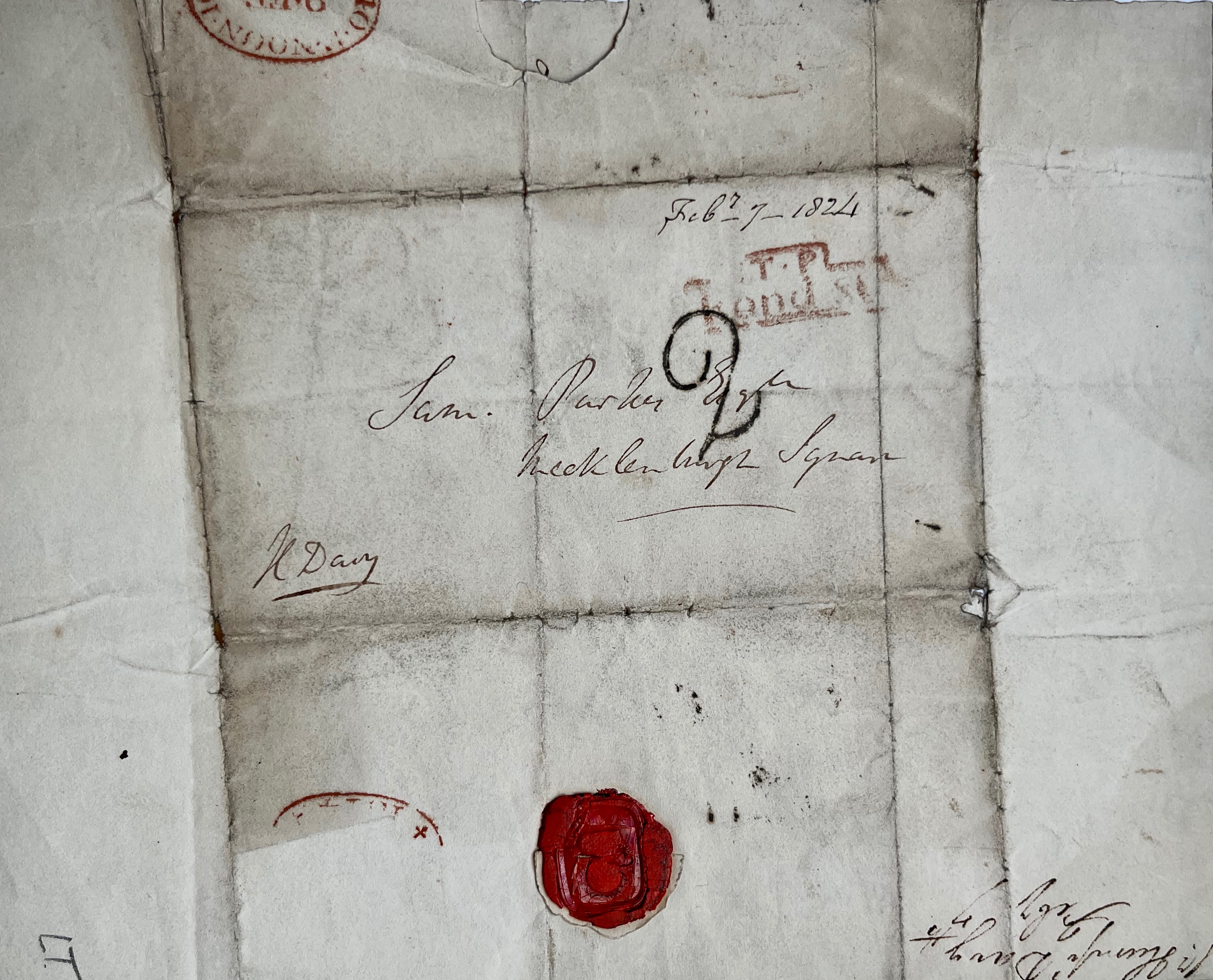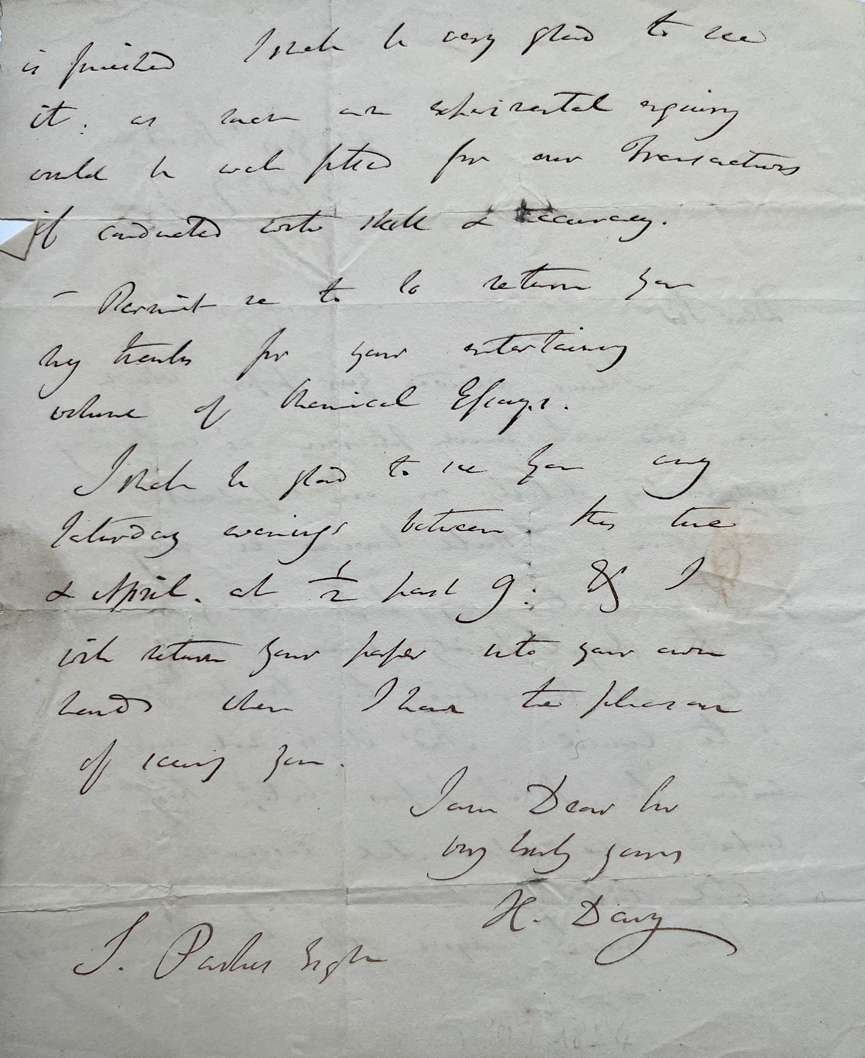 Humphry Davy (Penzance, Cornouailles, 1778/1829)Belle lettre scientifique d'Humphry Davy, alors président de la Royal Society of London for the Improvement of Natural Knowledge, adressée au chimiste Samuel Parkes.