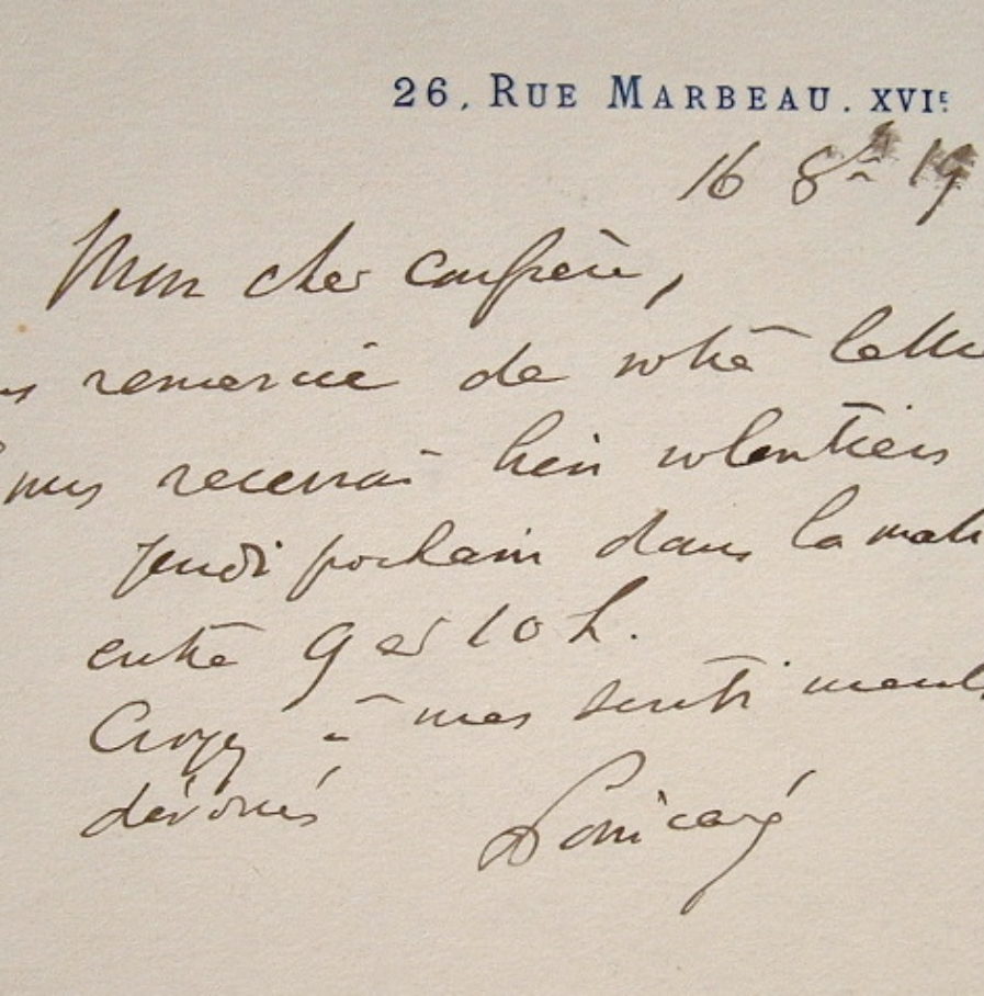 «Je vous remercie de votre lettre. Je vous recevrai bien volontiers jeudi prochain dans la matinée entre 9 et 10h [...]». [André Toulouse, qui était un proche ami de Poincaré, a prononcé un discours à l'occasion de l'inauguration du monument élevé à Bar-le-Duc, le 23 juillet 1950].