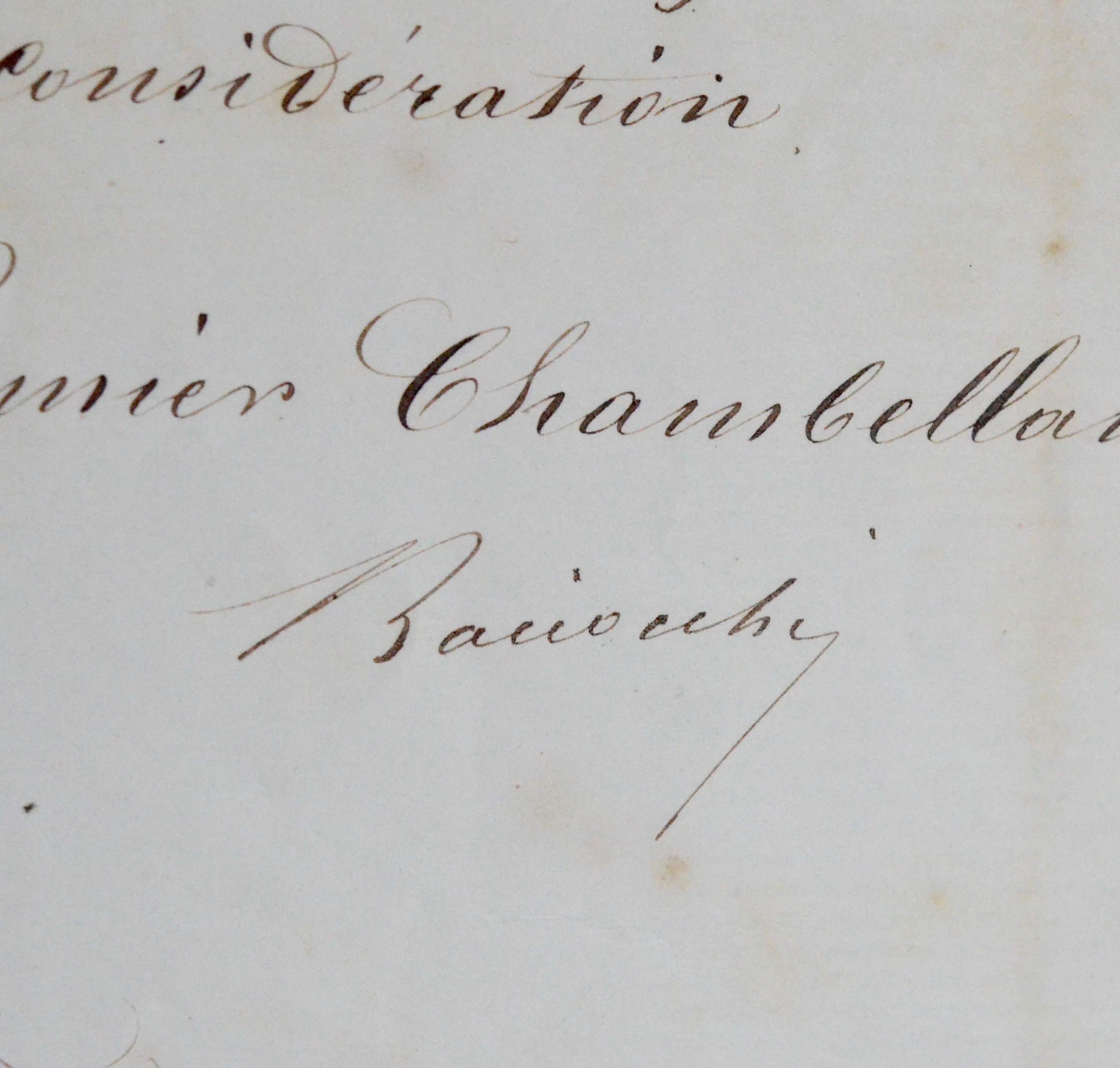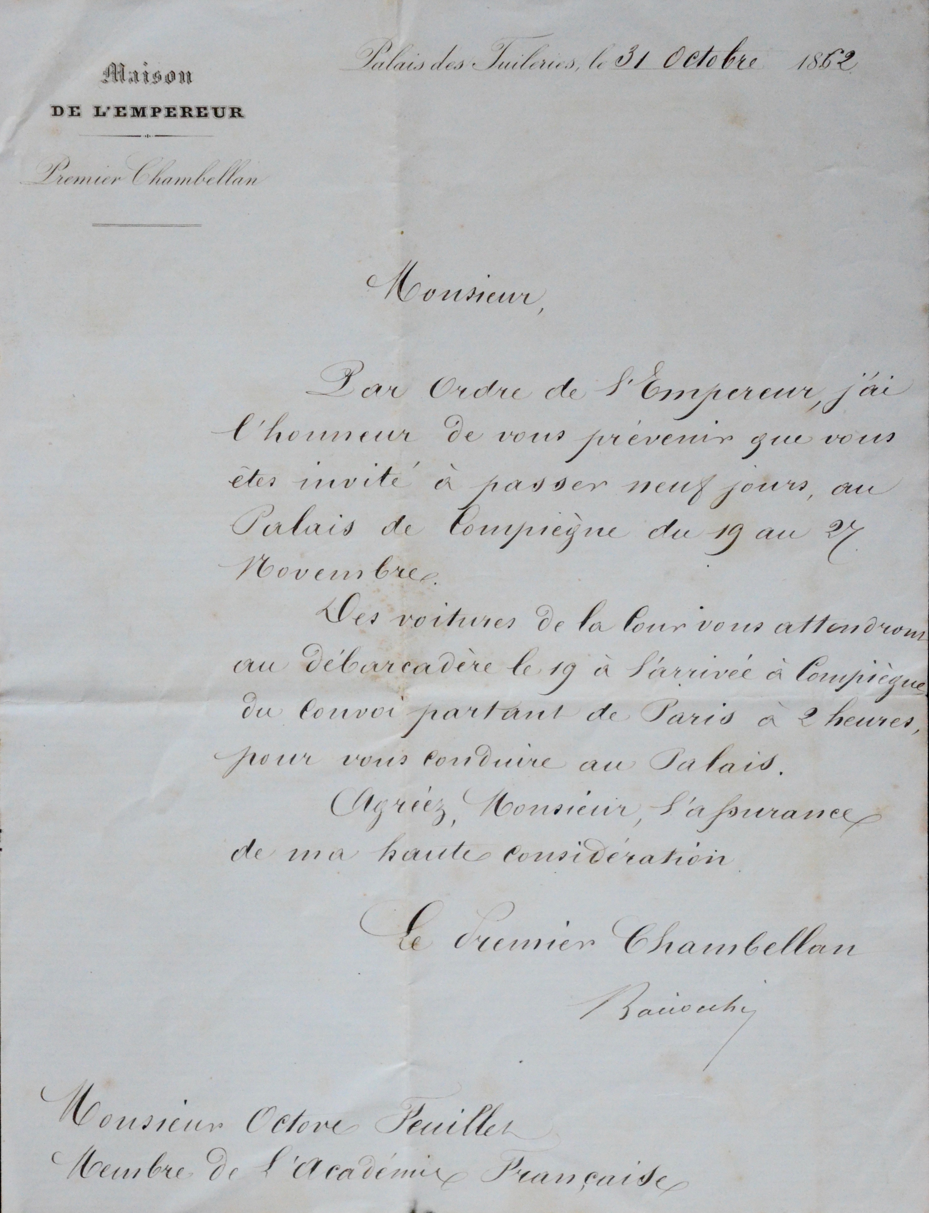 Félix Baciocchi (1803-1866), premier chambellan de Napoléon III, convie Octave Feuillet "Par ordre de l'Empereur", à passer neuf jours au Palais de Compiègne du 19 au 27 novembre 1862. "Des voitures de la Cour vous attendront au débarcadère le 19 à l'arrivée à Compiègne du convoi partant de Paris à 2 heures, pour vous conduire au Palais [...]".