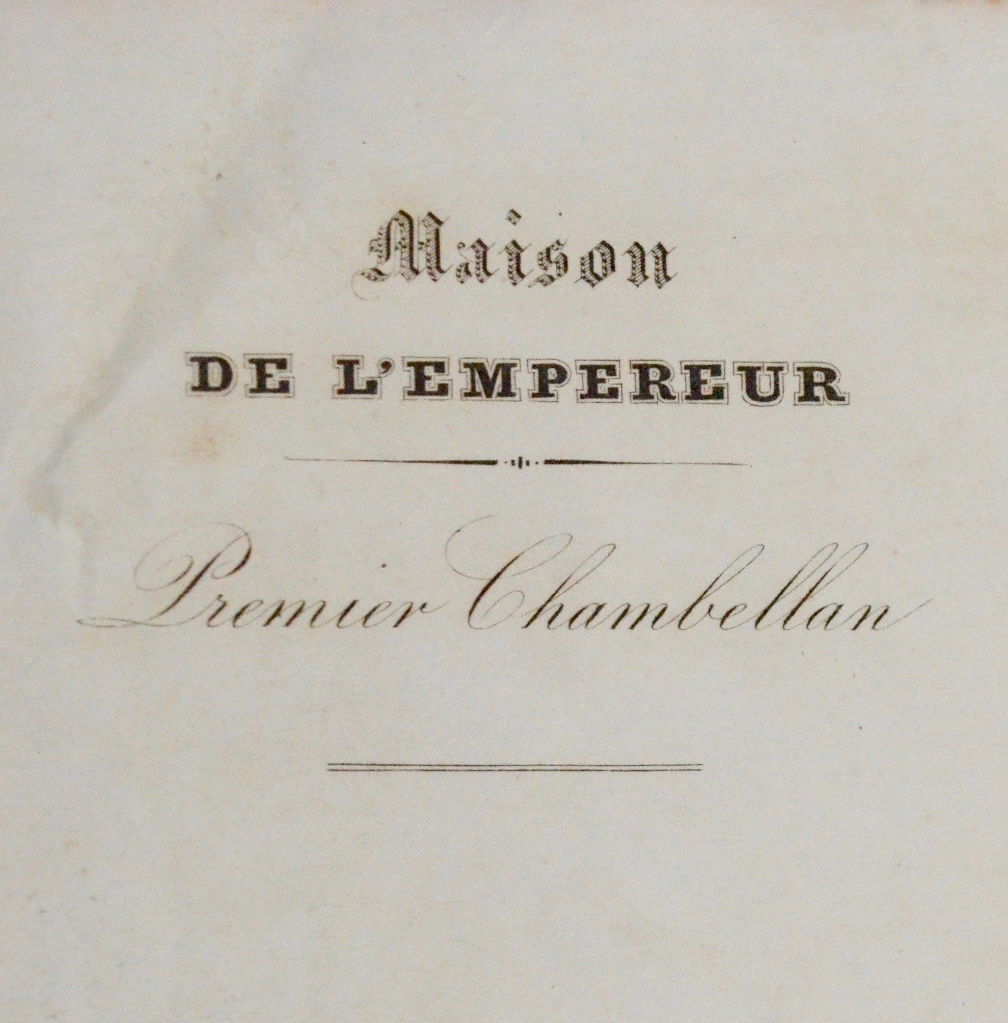 Encre brune sur feuillet double de papier vergé. En-tête imprimé "Maison de l'Empereur - Premier Chambellan".