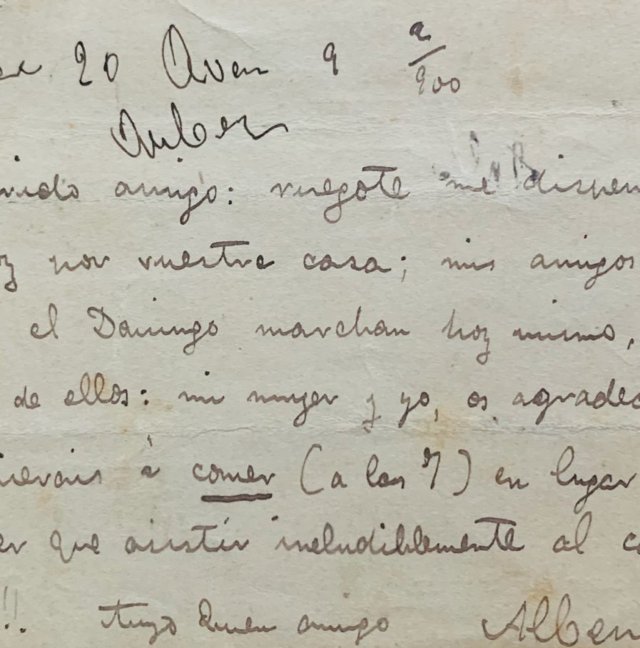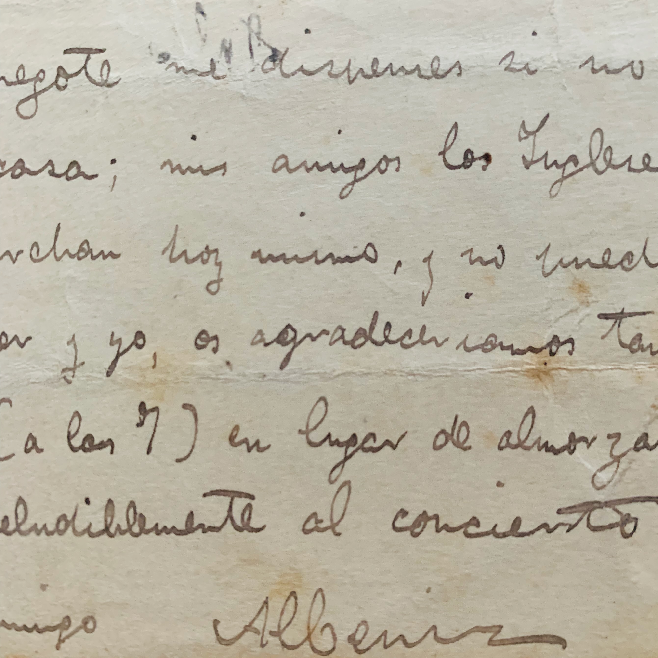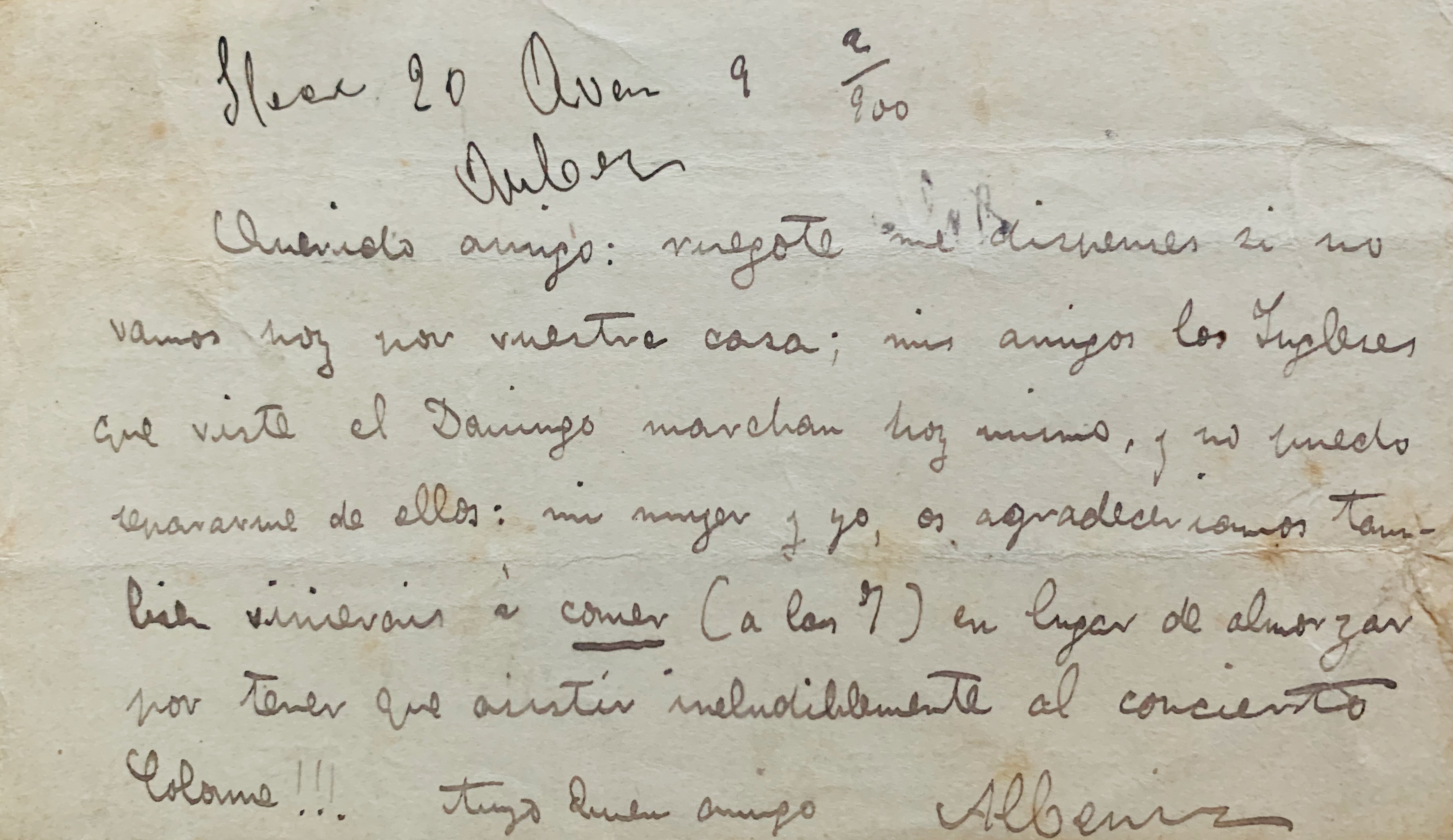 "Rugote me dispemes si no vamos hoy vuestro casa ; mis amigos los Lugleres que viste el domingo marchan hoy mismo, y no puedo separarme de ellos : mi mujer y yo, os agradechiamos tambien vinievais a comer (a los 7) en lugar de almozar por tener que aiutir ineludiblemente al concierto Colonne !!!"