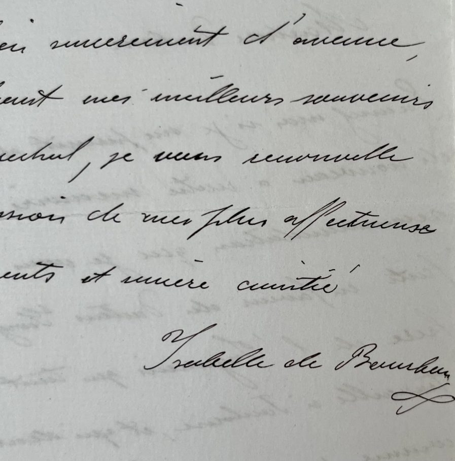 Isabelle II de Bourbon (Madrid , 1830 /1904 )Lettre d'Isabelle de Bourbon adressée à Madame de Mac Mahon, duchesse de Magenta, afin de lui rappeler la recommandation qu'elle lui a déjà faite en faveur du docteur Georges Dieulafoy (1839-1911) qui souhaite « obtenir la croix de la Légion d'Honneur ». "Dans cette confiance, je vous remercie bien sincèrement d'avance, et offrant mes meilleurs souvenirs au Maréchal [...]".