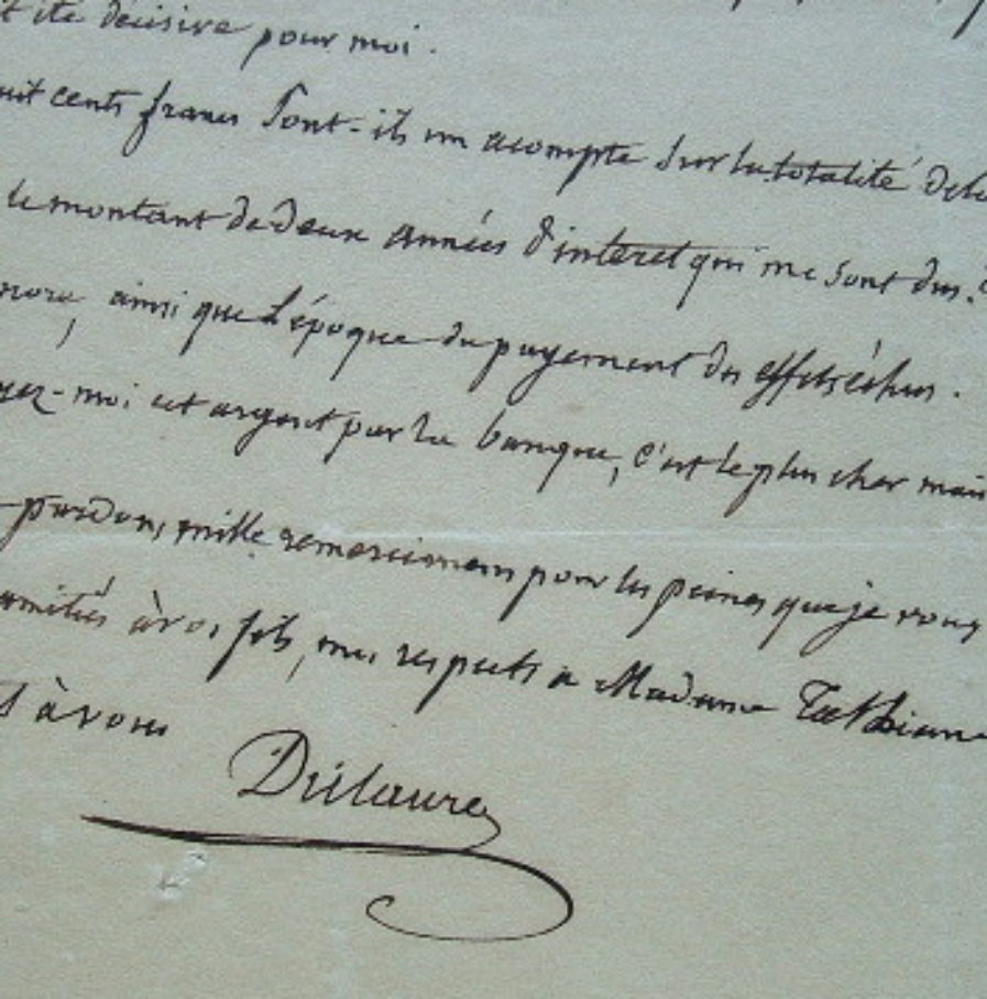 Jacques-Antoine Dulaure (Clermont-Ferrand, 1755/1835)Dulaure répond à son avocat à propos du procès qu'il intente à ses débiteurs. «Votre laconisme est admirable ; mais il ne satisfait pas entièrement la curiosité. Je vois bien que vous avez défendu avec zèle mes intérêts et que mes créanciers vous ont remis la somme de huit cents francs ; mais vous ne me parlez pas de la proposition qu'Isidor m'a faite ; vous ne m'apprenez pas s'il y persiste ; vous ne me dites pas votre opinion sur cette proposition, opinion qui aurait été décisive pour moi». Il se demande si la somme versée correspond à un acompte de la dette ou aux intérêts, quel est l'échéance du paiement. «Envoyez-moi cet argent par la banque, c'est le plus cher mais le plus sûr [...]».