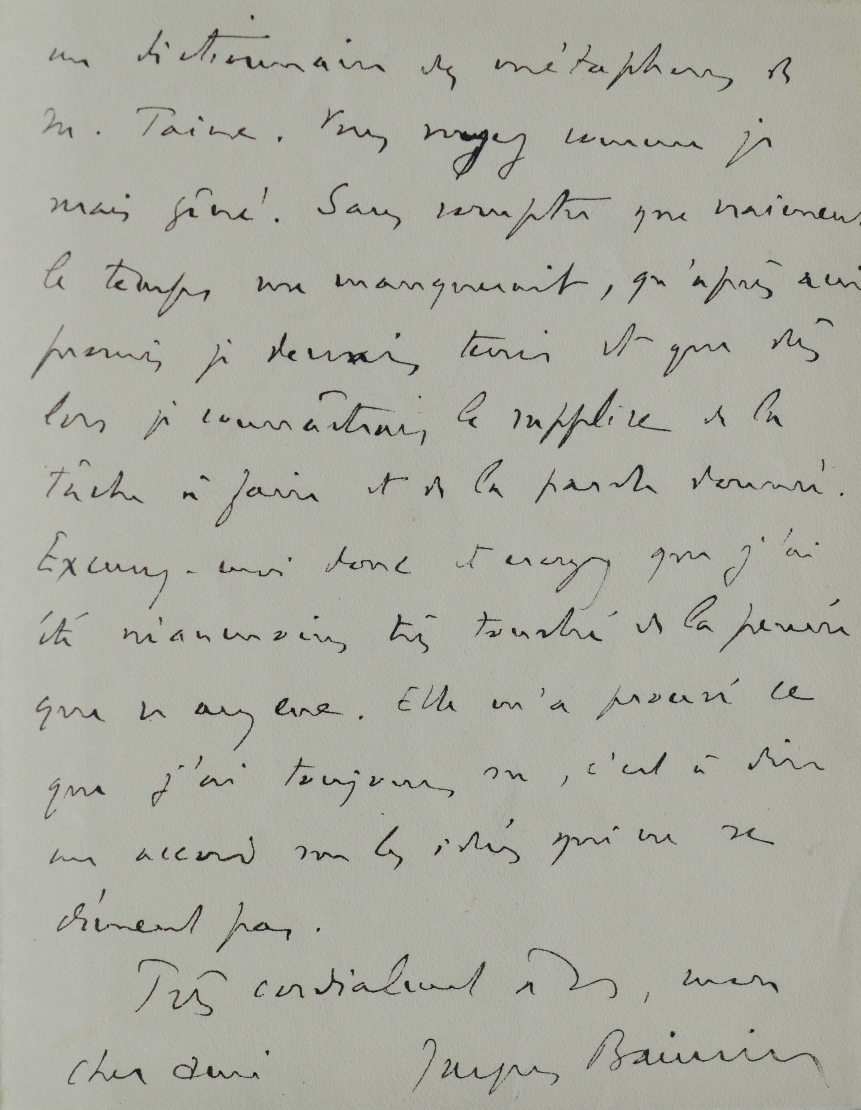 Bainville refuse d'écrire sur Hippolyte Taine : "[...] Taine... Quel gros morceau ! Après réflexion, je ne me sens pas de taille. Il y a toute une partie de son oeuvre sur laquelle je ne pourrais me permettre de porter un jugement (l'intelligence, etc...). Et puis je ne le vénère pas assez. J'avais commencé autrefois, ce qui n'était pas respectueux, un dictionnaire des métaphores de M. Taine. Vous voyez comme je serais gêné ! Sans compter que vraiment le temps me manquerait, qu'après avoir promis je devrais tenir et que dès lors je connaitrais le supplice de la tâche à faire et de la parole donnée [...]".