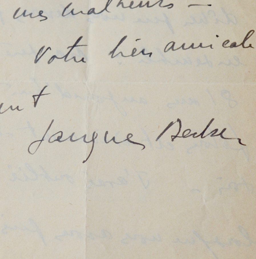Lettre et carte de visite de Jacques Becker, adressées à son ami l'acteur René Simon, fondateur du cours d'art dramatique éponyme.