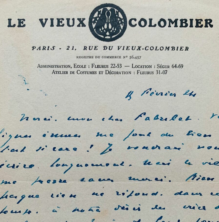 Après le départ successif de Louis Jouvet puis de Jules Romains, Jacques Copeau doit fermer son théâtre, en 1924. «Merci, mon cher Fabulet, vos lignes émues me font du bien. C'est si rare! Je voudrais vous écrire longuement. Mais la vie me presse sans merci. Rien, presque rien ne répond, dans ce temps, à notre désir de créer de la beauté. Mais il faut pourtant que nous fassions notre oeuvre [...]».
