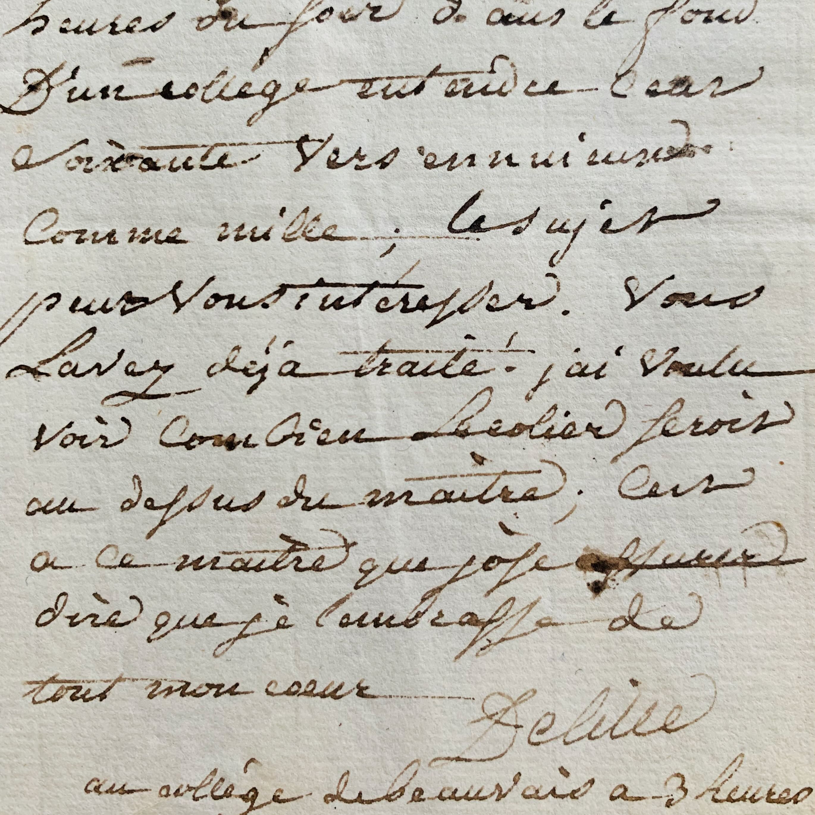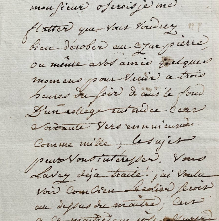 "Monsieur, oserois je me flatter que vous voudrez bien dérober au czar Pierre, ou même à vos amis, quelques momens pour venir à trois heures du soir dans le fond d'un collège entendre cent soixante vers ennuieux comme mille ; le sujet peut vous intéresser. Vous l'avez déjà traité. J'ai voulu voir combien l'écolier seroit au dessus du maître ; c'est à ce maître que j'ose dire que je l'embrasse de tout mon coeur".