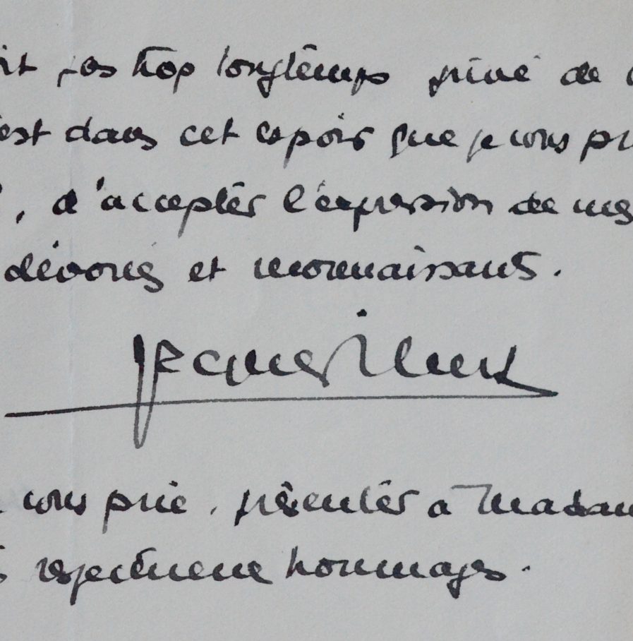 Jacques Ibert vient d'apprendre la démission de Ricou, du poste de directeur de l'Opéra Comique et s'en désole. Il comprend néanmoins la charge que représente un tel poste et les "difficultés grandissantes qui entourent la gestion d'une telle scène". Le théâtre lyrique le regrettera et les musiciens aussi. Il ajoute "Pour ma part, je veux vous exprimer à nouveau toute ma profonde gratitude pour l'accueil affectueux que vous m'avez toujours réservé, et la confiance que vous avez bien voulu témoigner à mes ouvrages [...]".