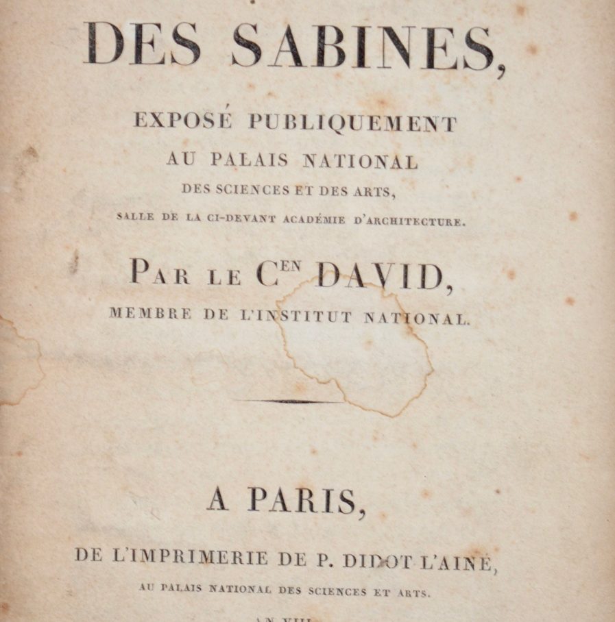 Dans cette brochure intitulée : "Le tableau des Sabines exposé publiquement au Palais National des Sciences et des Arts, salle de la ci-devant Académie d'Architecture par le Citoyen David, membre de l'Institut National", David livre une explication de sa toile en trois temps : une justification du choix d'une scène antique, une mise en perspective historique, et, dans une "note sur la nudité de mes héros", une justification de son choix artistique. "Une objection qu'on m'a déjà faite, et qu'on ne manquera pas de reproduire, c'est celle de la nudité de mes héros [...]. Voici comment j'y réponds [...]".