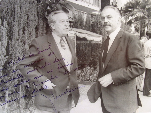 Photo de Jacques Médecin en compagnie de son ami, le romancier Michel de Saint-Pierre, dédicacée à ce dernier : «en souvenir de retrouvailles amicales dans notre combat qui ne finira qu'avec le triomphe des saines valeurs de droite».