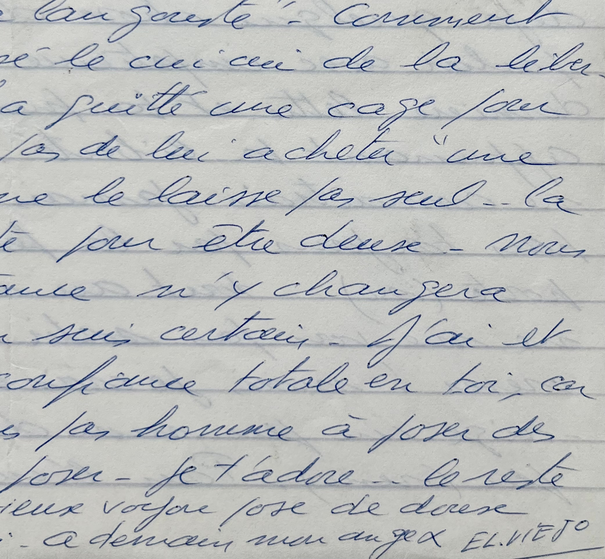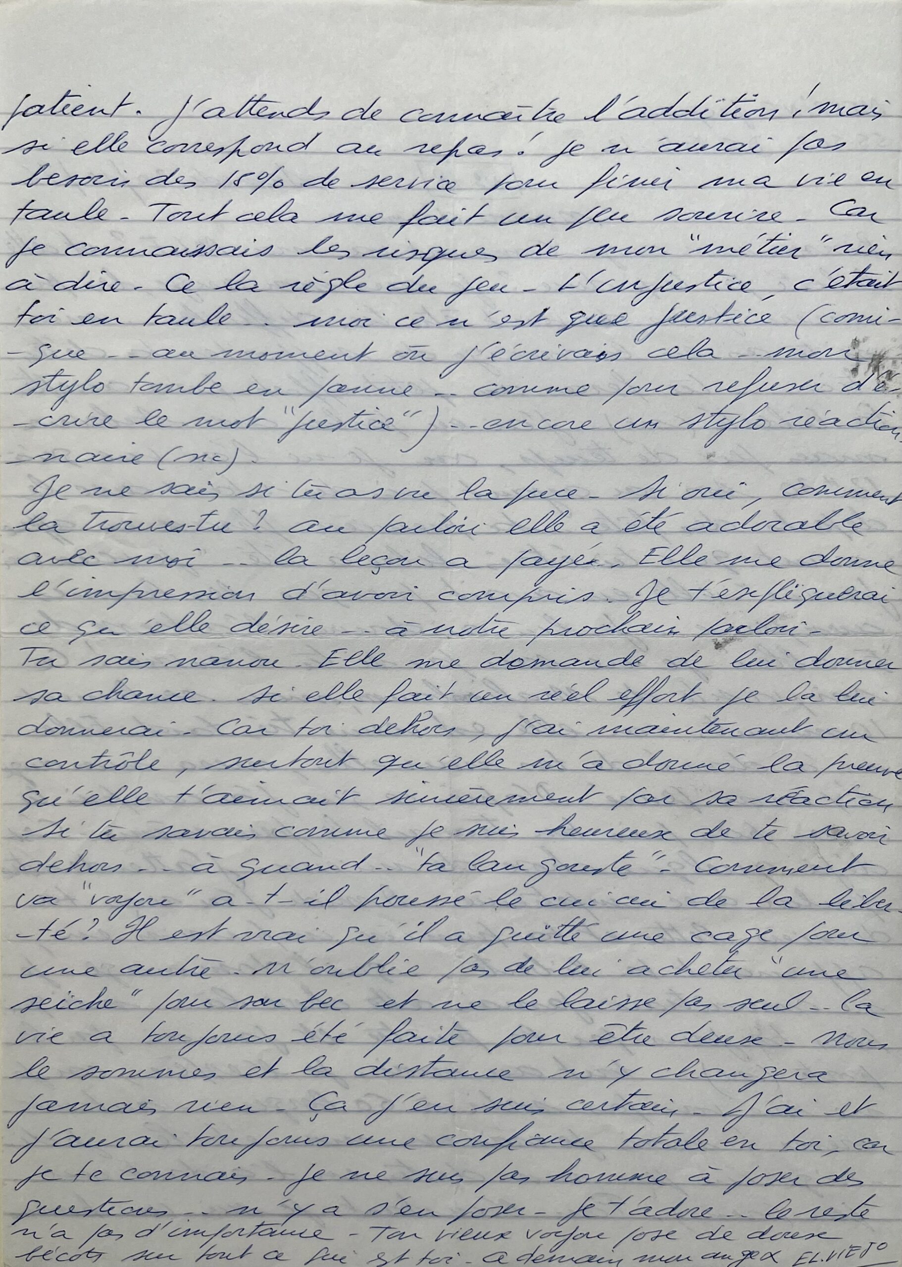 "Nanou d'amour. Bonsoir mon Ange. Comment va ma MLF ? et cette liberté par trop dure ? Je sais mon ange, les premiers jours doivent être difficiles... mais si tu as eu le courage de supporter ta détention tu feras un petit effort pour accepter ta liberté (sic). J'ai eu parloir avec Sabrina, mais peu de temps, car je ne l'ai vue qu'à 12h30 [...]. Sa première phrase en apprenant que tu étais libre a été : "Je veux voir Janine", elle en avait presque les larmes aux yeux. Je lui ai donné l'adresse des "Érables", je ne sais pas si tu l'as vue! Ce soir visite de Malimbaum, mais seulement 10 minutes car elle est venue très tard [...]. D'après ce que j'ai compris, tu n'as pas pris ton travail le jour même. C'est déjà quelque chose de mieux. J'attends notre parloir avec impatience. A midi j'ai reçu ta dernière lettre et ta première impression en apprenant ta liberté... Quel dommage ! Je ne connaîtrai jamais cette chose là... moi qui pars toujours par la fenêtre et jamais par la porte (sic)... tout au moins je l'espère, car je ne me vois pas sortir à 60 berges... autant crever ! mais je crois en mon étoile... je dirige un peu mon destin en l'aidant un peu (sic). Pour l'instant je suis un homme patient. J'attends de connaître l'addition ! mais si elle correspond au repas ! je n'aurai pas besoin des 15% de service pour finir ma vie en taule. Tout cela me fait un peu sourire. Car je connais les risques de mon "métier" rien à dire à la règle du jeu. L'injustice, c'était toi en taule... moi ce n'est que justice (comique... au moment où j'écrivais cela mon stylo tombe en panne... comme pour refuser d'écrire le mot "justice")... encore un stylo réactionnaire (sic). Je ne sais pas si tu as vu la puce. Si oui, comment la trouves-tu? au parloir elle a été adorable avec moi... la leçon a payé [...]". Il lui donne des consignes pour s'occuper de son perroquet "voyou". "J'ai et j'aurai toujours une confiance totale en toi, car je te connais. Je ne suis pas homme à poser des questions... n'y à s'en poser. Je t'adore... le reste n'a pas d'importance. Ton vieux voyou pose de doux bécots sur tout ce qui est toi. A demain, mon ange". Signée "El Viejo".
