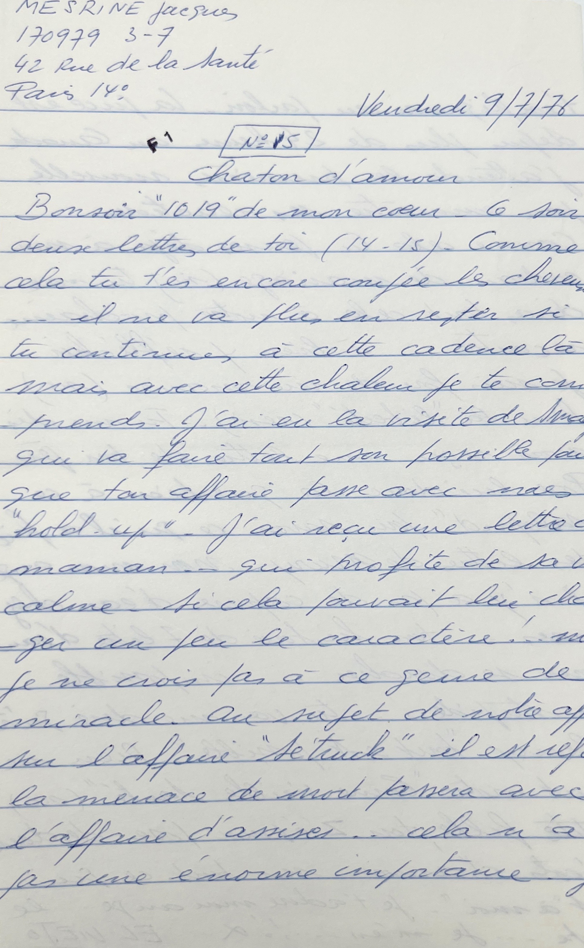 "Chaton d'amour. Bonsoir "1019" de mon coeur. Ce soir deux lettres de toi (14-15). Comme cela tu t'es encore coupée les cheveux... il ne va plus en rester si tu continues à cette cadence là [...]. J'ai eu la visite de Smadja qui va faire tout son possible pour que ton affaire passe avec mes "hold-up" [...]. Au sujet de notre appel sur l'affaire « Setruck » il est refusé, la menace de mort passera avec l'affaire d'assises. Cela n'a pas une énorme importance. Je t'expliquerai au parloir. La puce est depuis plus de 24 heures au Canada j'attends les premières nouvelles pour connaître ses réactions.