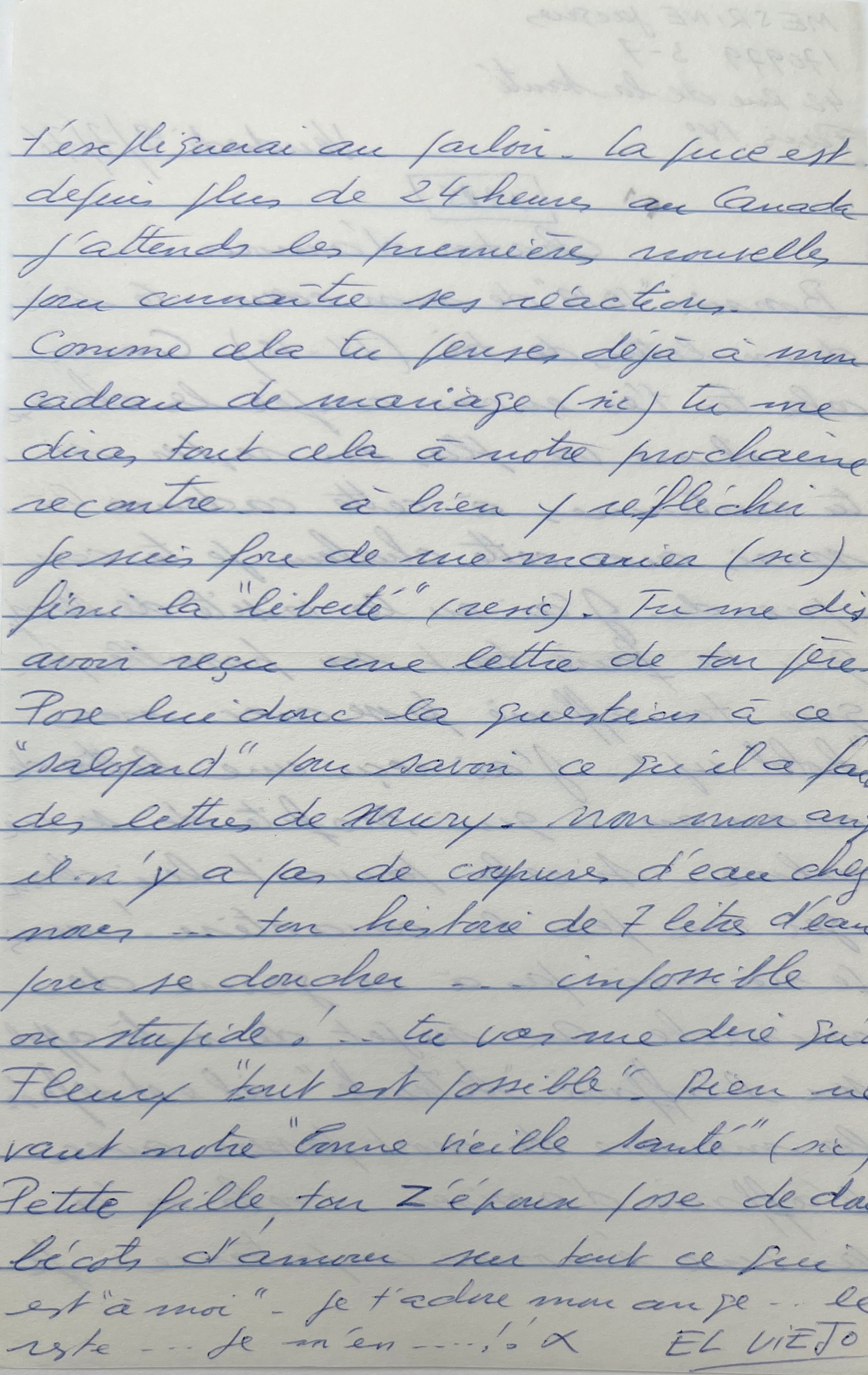 Comme cela tu penses déjà à mon cadeau de mariage (sic), tu me diras tout cela à notre prochaine rencontre... à bien y réfléchir je suis forcé de me marier (sic) fini la "liberté" (resic). Tu me dis avoir reçu une lettre de ton père. Pose lui donc la question à ce "salopard" pour savoir ce qu'il a fait des lettres de Mury. Non mon ange, il n'y a pas de coupures d'eau chez nous... ton histoire de 7 litres d'eau pour se doucher... impossible ou stupide!... Tu vas me dire jusqu'à Fleury "tout est possible". Rien ne vaut notre "bonne vieille Santé" (sic).