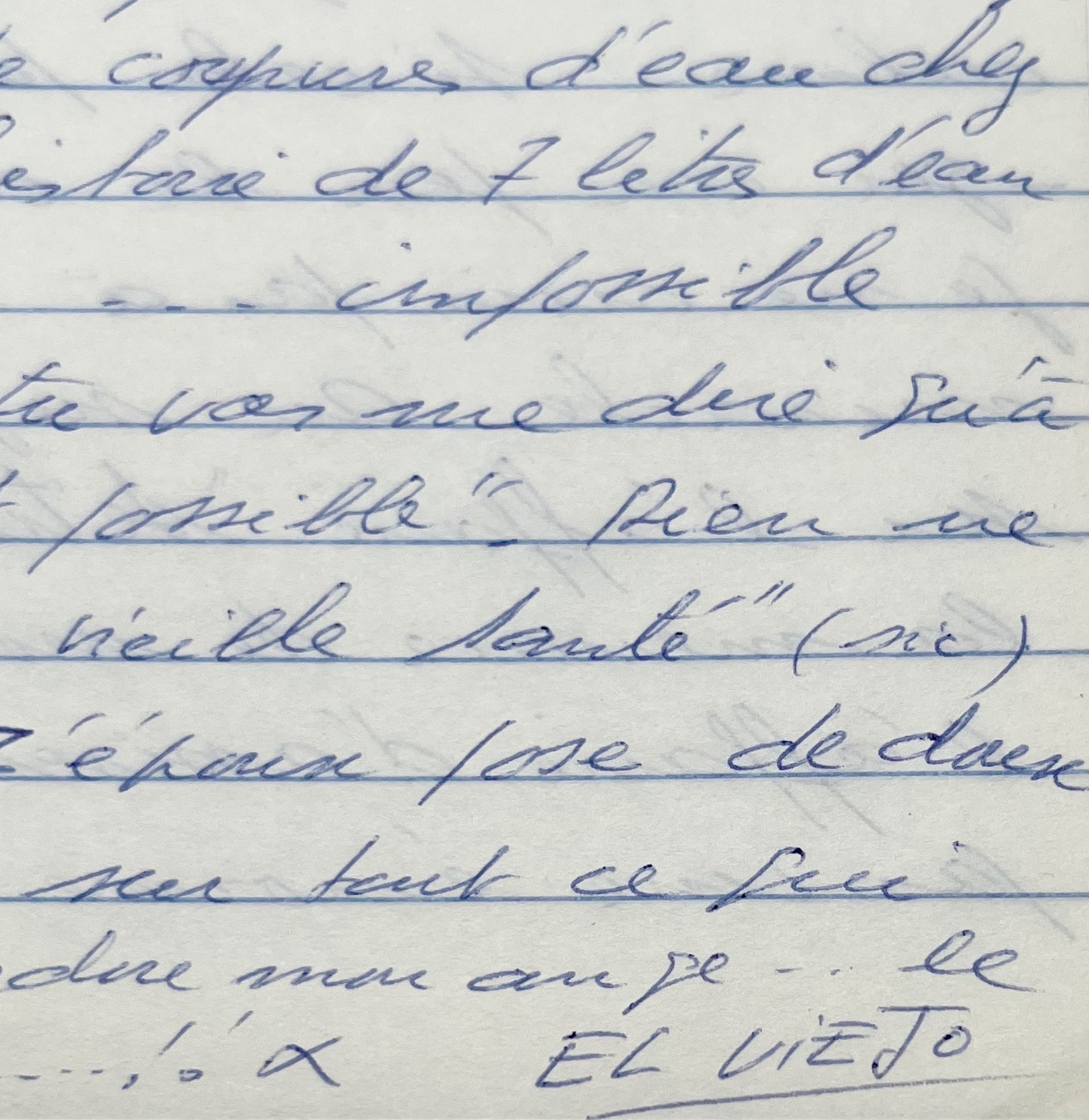 Petite fille, ton Z'époux pose de doux bécots d'amour sur tout ce qui est "à moi". Je t'adore mon ange... le reste... je m'en ... !!". Signé "El Viejo" [le Vieux].