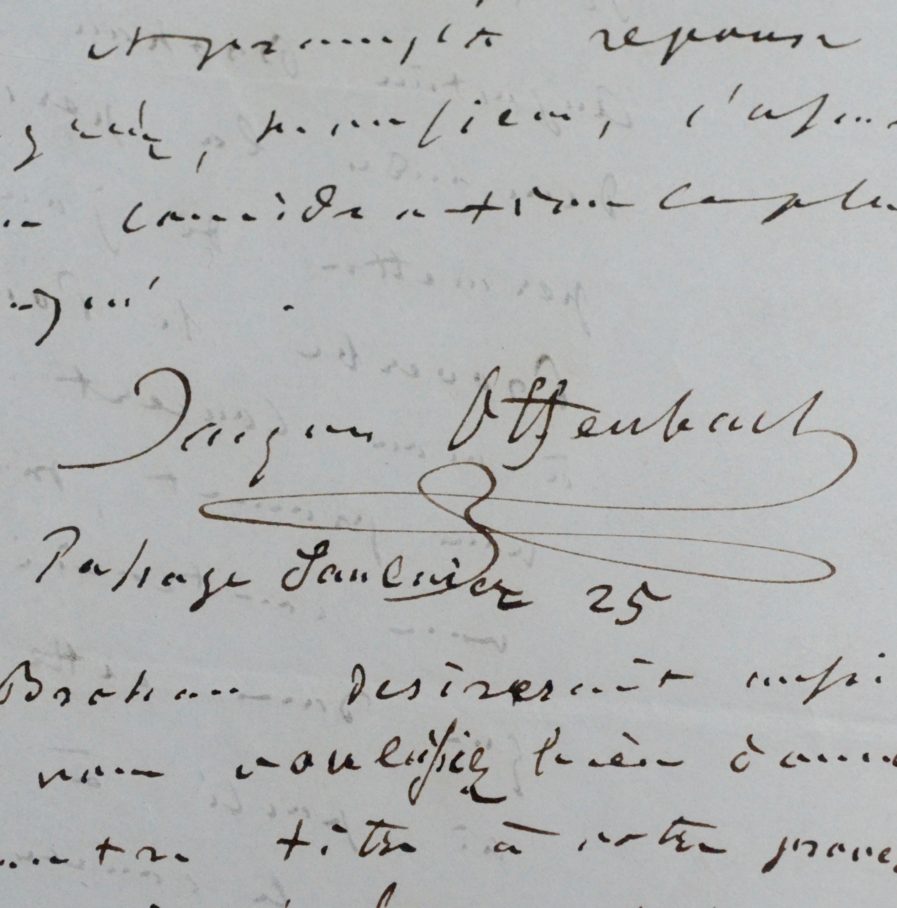 Jacques Offenbach (Cologne, 1819/1880)Jacques Offenbach se fait le porte-parole de l'actrice Augustine Brohan qui désirerait pouvoir jouer Le Pour et le contre, lors de son prochain concert. "Mlle Brohan vous promet, monsieur, si cela vous contrarie, de ne la jouer que dans cette occasion. J'en ai parlé à Lévy qui, en ce qui le concerne, m'a donné l'autorisation. Il me manque donc la vôtre. Oserai-je espérer que vous me la donniez ? Je vous en serais, Monsieur, personnellement très reconnaissant [...]". L'actrice voudrait également que Feuillet changeât le nom de sa pièce "car on a joué, sous ce titre, au théâtre français, une très mauvaise pièce, et elle craindrait que l'on ne confondit, l'une, avec l'autre".