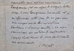 « Non, pas de roman encore mais il est toujours entendu qu'il sera pour la Revue de Paris. J'aurai très bientôt terminé une espèce de nouvelle qui est un souvenir d'enfance (et un effet de l'âge). Elle sera d'une longueur honnête et je m'efforcerai cette fois de ne pas vous ennuyer avec des corrections d'auteur intempérantes [...]. M. Duhamel (Série Noire) qui édite le 1er roman de Georges Bayle me demande s'il n'y aurait pas moyen d'avoir communication des nouvelles que je vous ai remises (étrangleur, pompiste, etc.) et qui feraient peut être son affaire pour un film à sketches [...]. Je m'aperçois que je vous ai donné la mauvaise version du Pique Nique. En effet, sur l'épreuve que je vous destinais, j'avais modifié l'épisode de la (boule ?) de jardin en faisant intervenir non pas l'oncle Henri mais l'Oncléon ce qui donne un peu plus de cohésion au récit [...] ».