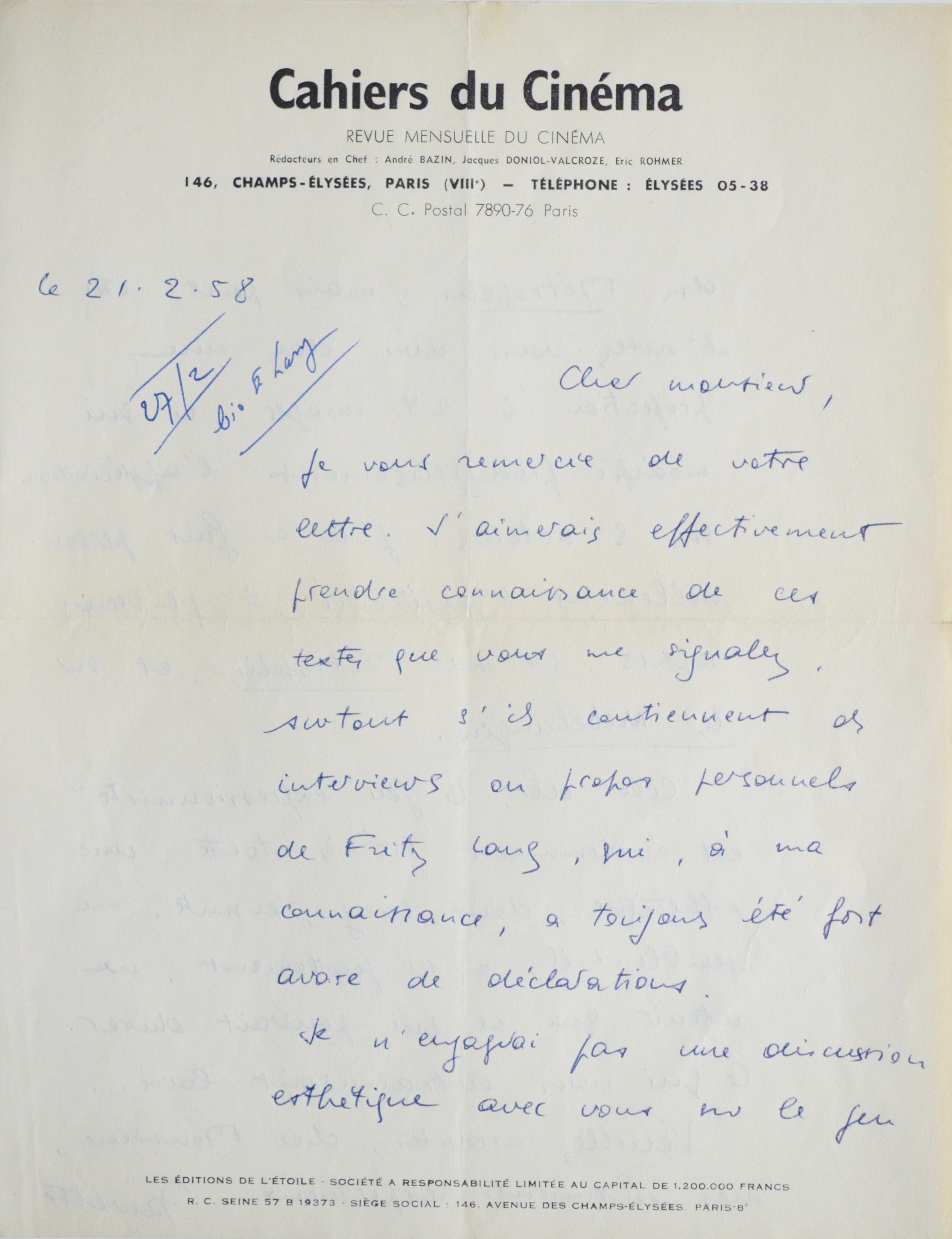 "[...] J'aimerais effectivement prendre connaissance de ces textes que vous me signalez. Surtout s'ils contiennent des interviews ou propos de Fritz Lang, qui, à ma connaissance, a toujours été fort avare de déclarations.