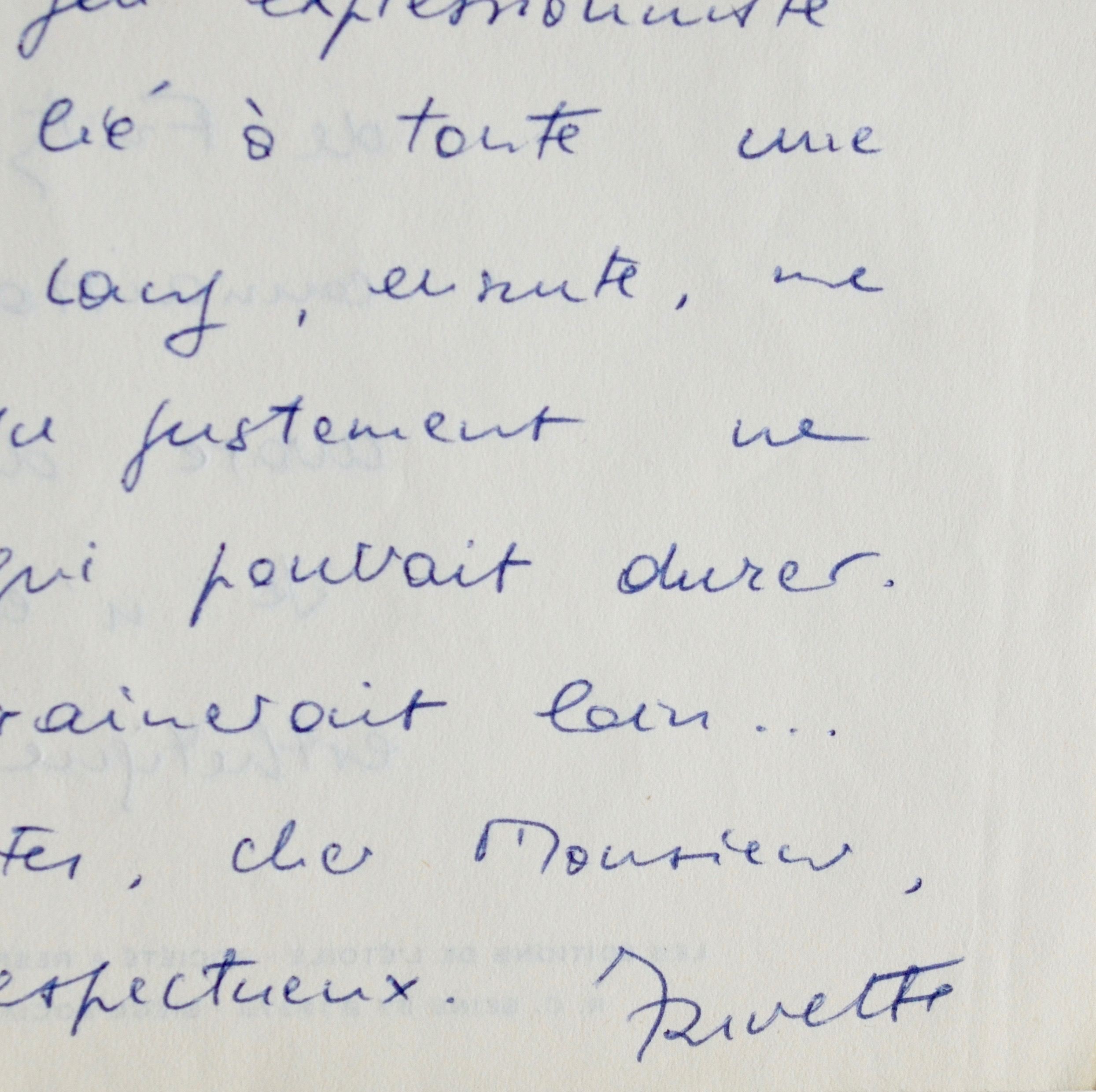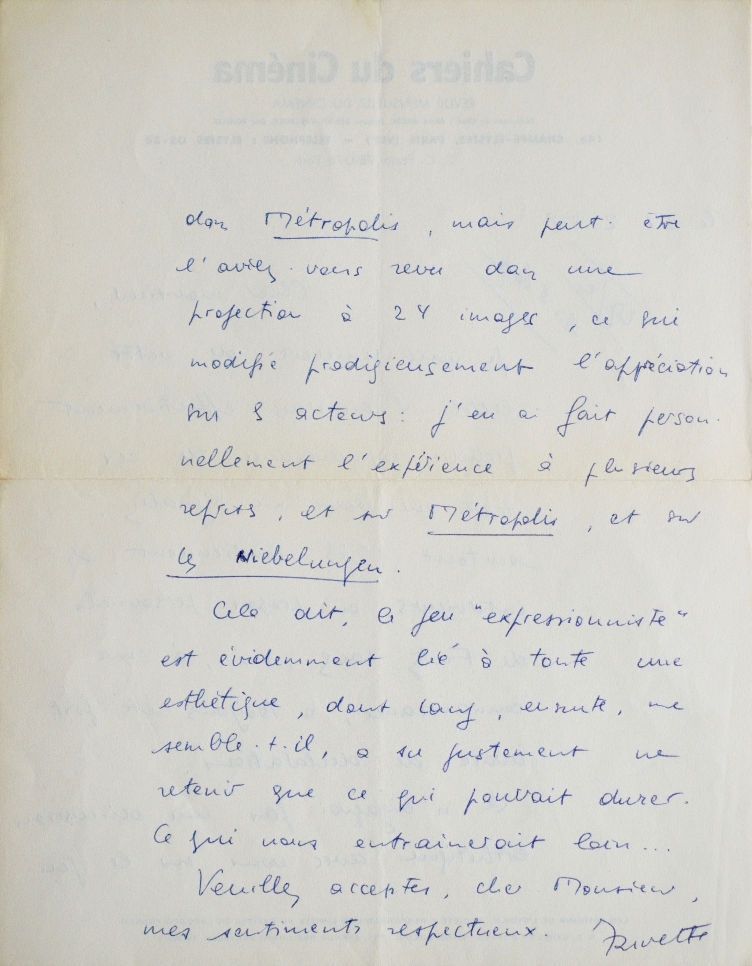 Rare et belle lettre de Jacques Rivette, relative à Fritz Lang et à son chef d'oeuvre Metropolis.