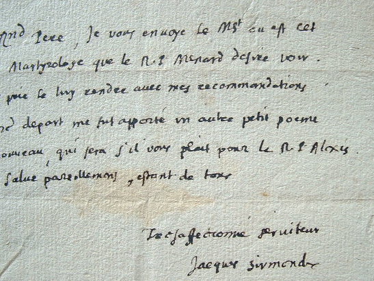 «Mon Rnd Père, Je vous envoye le Ms [manuscrit] où est cet ancien martyrologe que le R. P. Ménard désire voir [en 1645, Dom Luc publia la Lettre de saint Barnabé dont l'édition avait été préparée par Dom Hugues Ménard]. Je vous prie de luy rendre avec mes recommandations. Après votre départ me fut apporté un autre petit poème tout nouveau qui sera, s'il vous plaît, pour le R.P. Alexis [...]». [Le révérend Père Dom Luc intégra l'abbaye de Saint-Germain-des-Prés en 1637 et fut chargé du classement de la bibliothèque].
