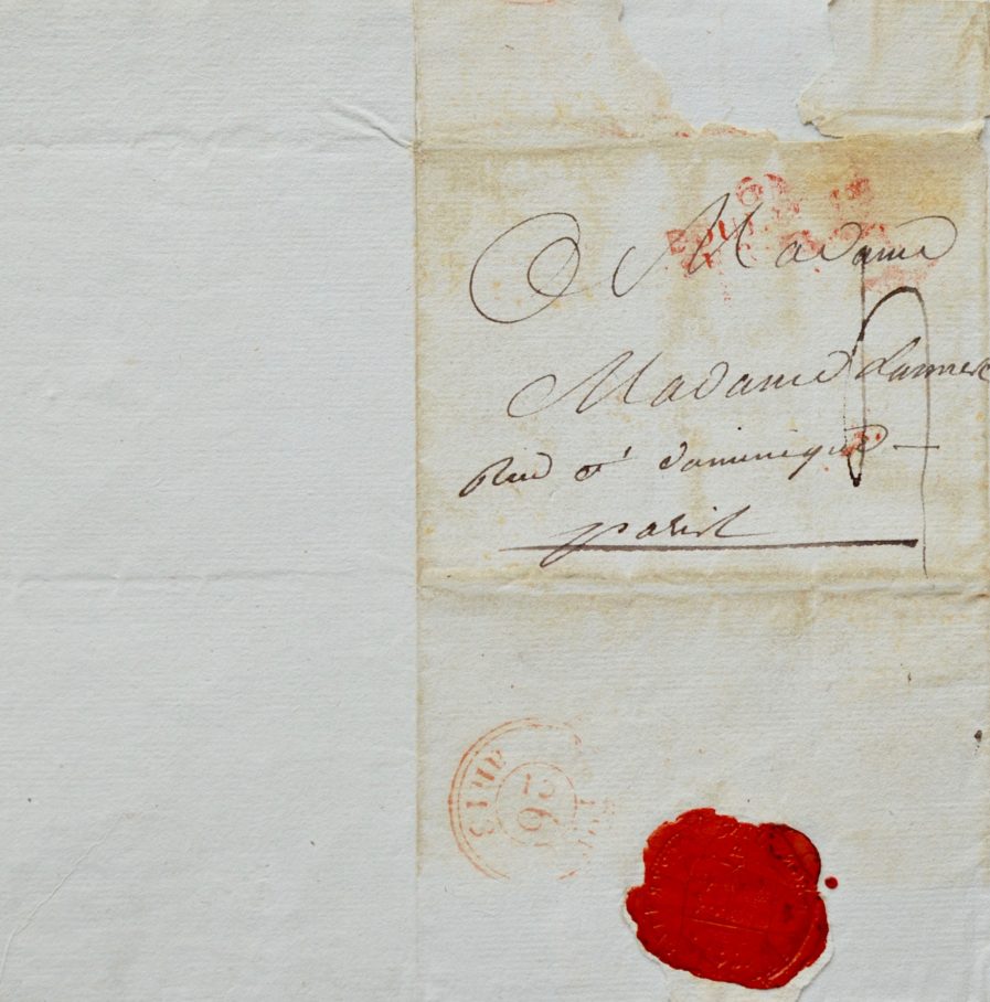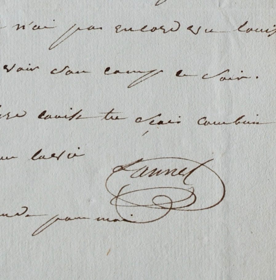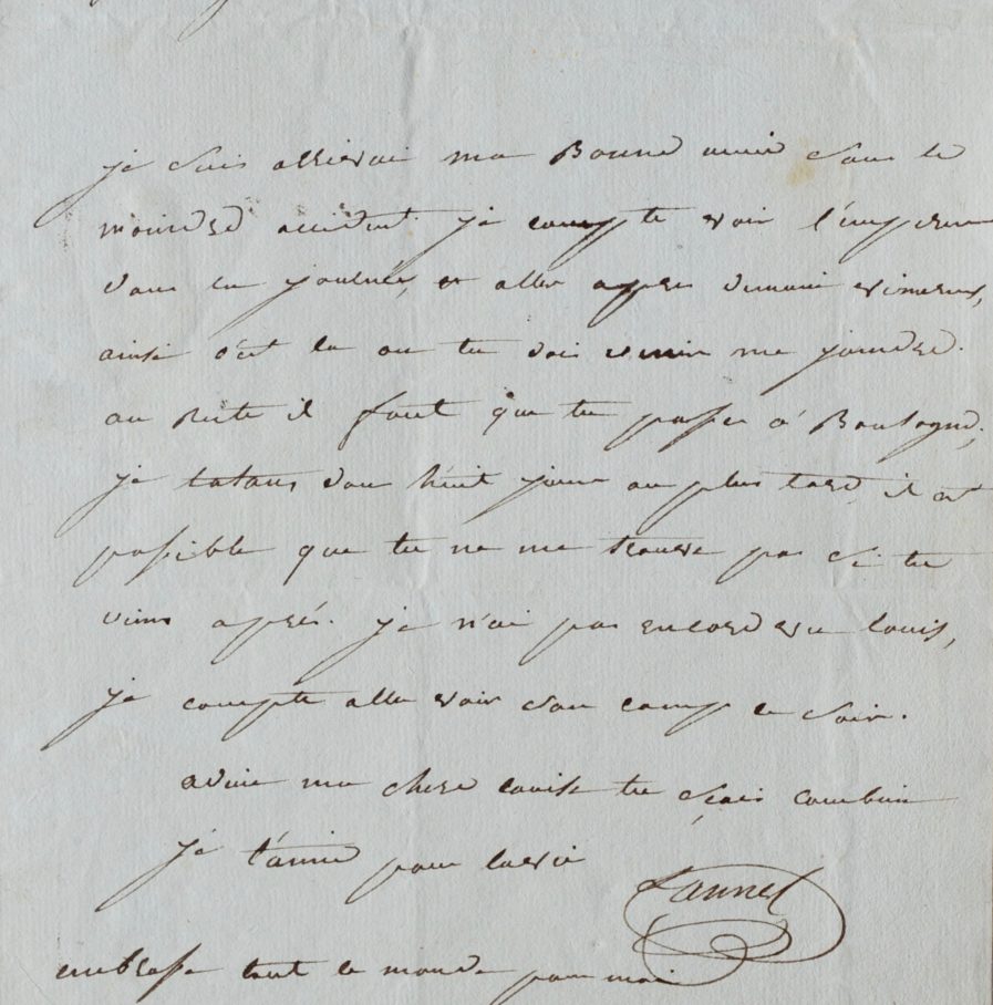 "Je suis arrivai, ma bonne amie, sans le moindre accident. Je compte voir l'empereur dans la journée et aller après-demain Vimereux, ainsi c'est là où tu dois venir me rejoindre. Au reste, il faut que tu passes à Boulogne ; je t'ahans dans huit jours au plus tard, il est possible que tu ne me trouve pas si tu viens après. Je n'ai pas encore vu Louis, je compte aller voir son camp ce soir. Adieu, ma chère Louise, tu sais combien je t'aime pour la vie. Embrasse tout le monde pour moi [...]"