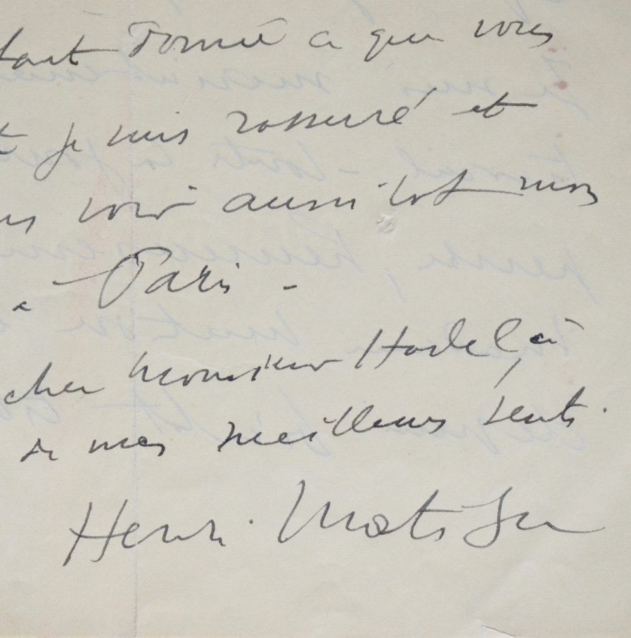 Henri Matisse (Le Cateau, 1869/1954)Lettre autographe signée d'Henri Matisse, adressée au docteur Hodel.