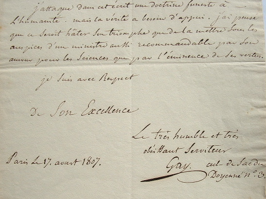 Jean-Antoine Gay vient de publier son premier ouvrage : Vues sur le caractère et le traitement de l'apoplexie, qui réfute la doctrine du Dr Portal sur cette maladie. Il en adresse un exemplaire au ministre. «J'attaque dans cet écrit une doctrine funeste à l'humanité [la saignée]. Mais la vérité a besoin d'appui. J'ai pensé que ce seroit hâter son triomphe que de la mettre sous les auspices d'un ministre aussi recommandable par son amour pour les sciences que par l'éminence de ses vertus». [Le chirurgien Jean-Antoine Gay, reçu médecin de l'ancienne faculté de Montpellier en 1785, s'élève contre le traitement de l'apoplexie par la saignée ; il publiera l'année suivante, un Traité contre la saignée].