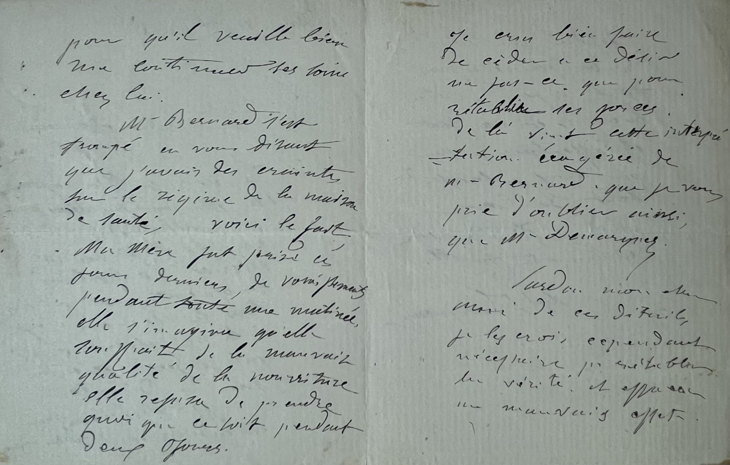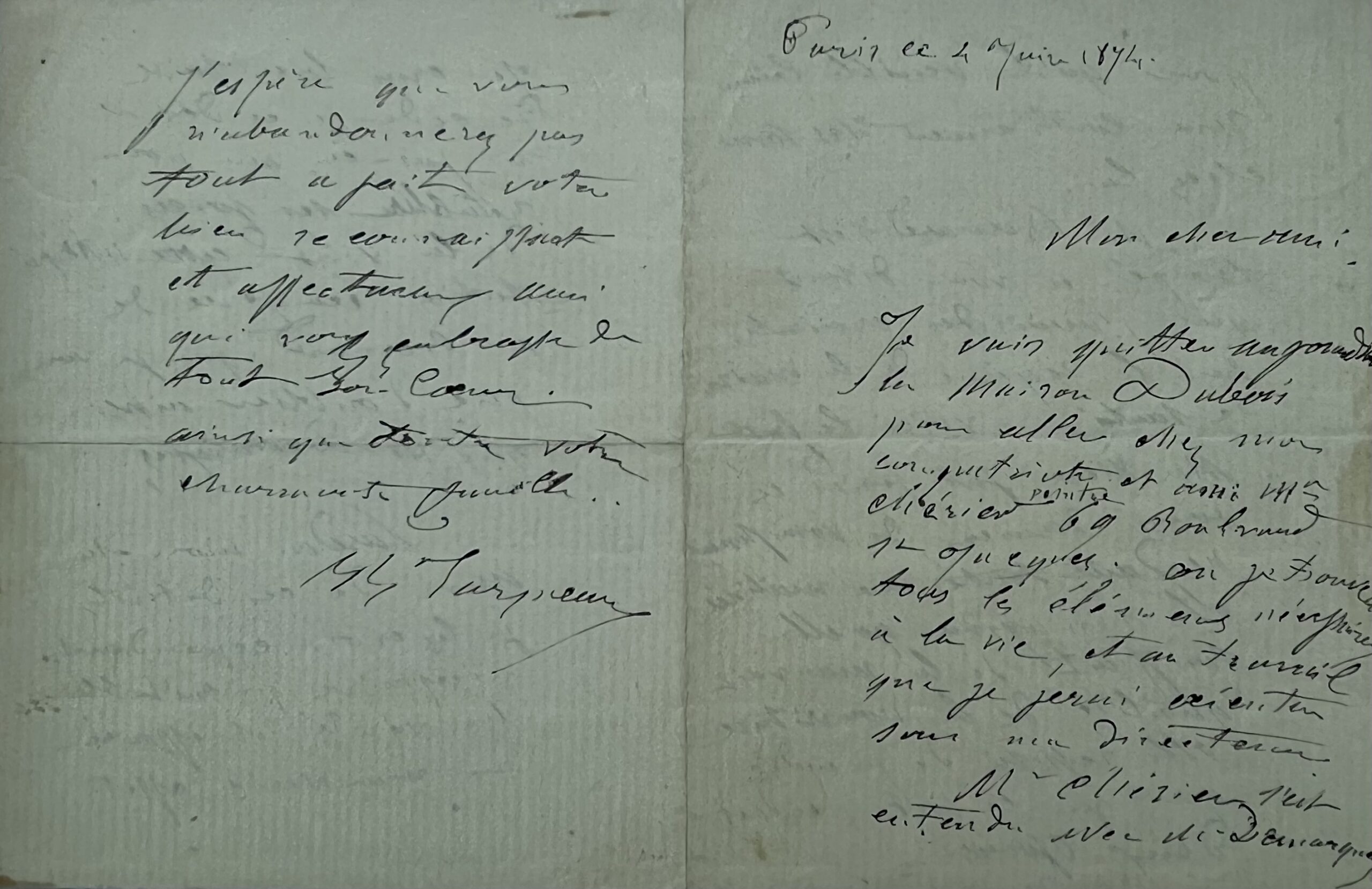 "Je vais quitter aujourd'hui la maison Dubois pour aller chez mon compatriote et ami Mr Chérier peintre 69 boulevard St Jacques où je trouverai tous les éléments nécessaires à la vie, et au travail que je ferai exécuter sous ma direction. Mr Chérier s'est entendu avec Mr Demarquey pour qu'il veuille bien me continuer ses soins chez lui. M. Bernard s'est trompé en vous disant que j'avais des craintes sur le régime de la maison de santé, voici le fait. Ma mère fut prise ces derniers jours de vomissements pendant toute une matinée, elle s'imagina qu'elle souffrait de la mauvaise qualité de la nourriture. Elle refusa de prendre quoi que ce soit pendant deux jours. Je crus bien faire de céder à ce désir ne serait-ce que pour rétablir ses forces. De là vient cette interprétation exagérée de M. Bernard que je vous prie d'oublier ainsi que M. Demarquey. Pardon mon cher ami de ces détails, je les crois, cependant nécessaires pr rétablir la vérité et effacer un mauvais effet. J'espère que vous n'abandonnerez pas tout a fait votre bien reconnaissant et affectueux ami qui vous embrasse de tout son cœur ainsi que toute votre charmante famille".