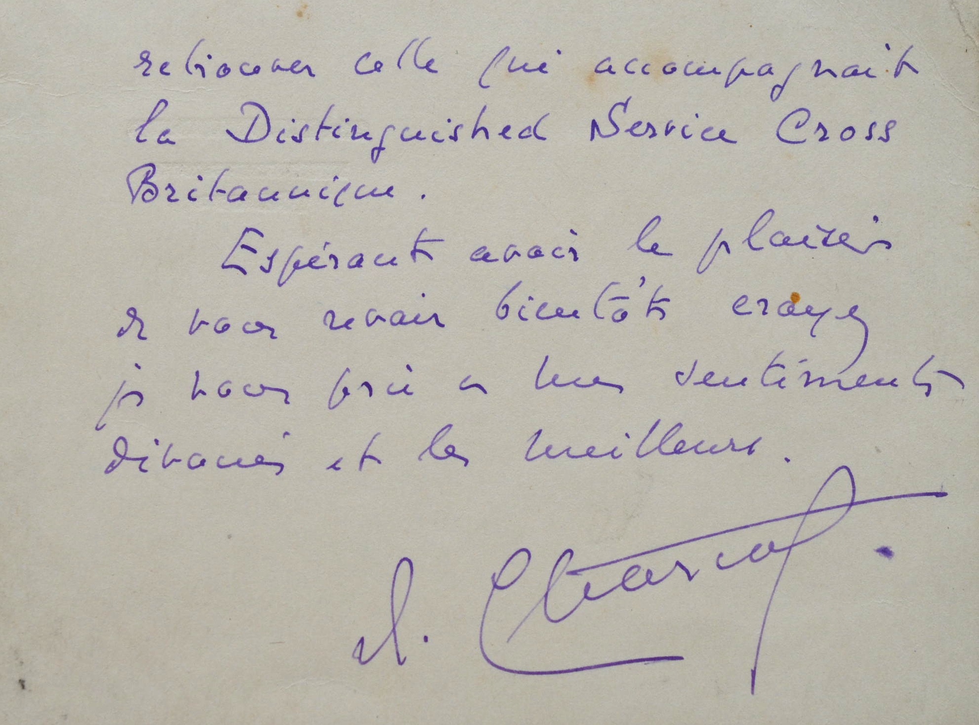 « Suivant le désir que vous avez bien voulu m'exprimer je vous envoie copie de ma citation à l'ordre du Corps d'armée (citation française). J'ai n'ai pu retrouver celle qui accompagnait la Distinguished Service Cross Britannique. »