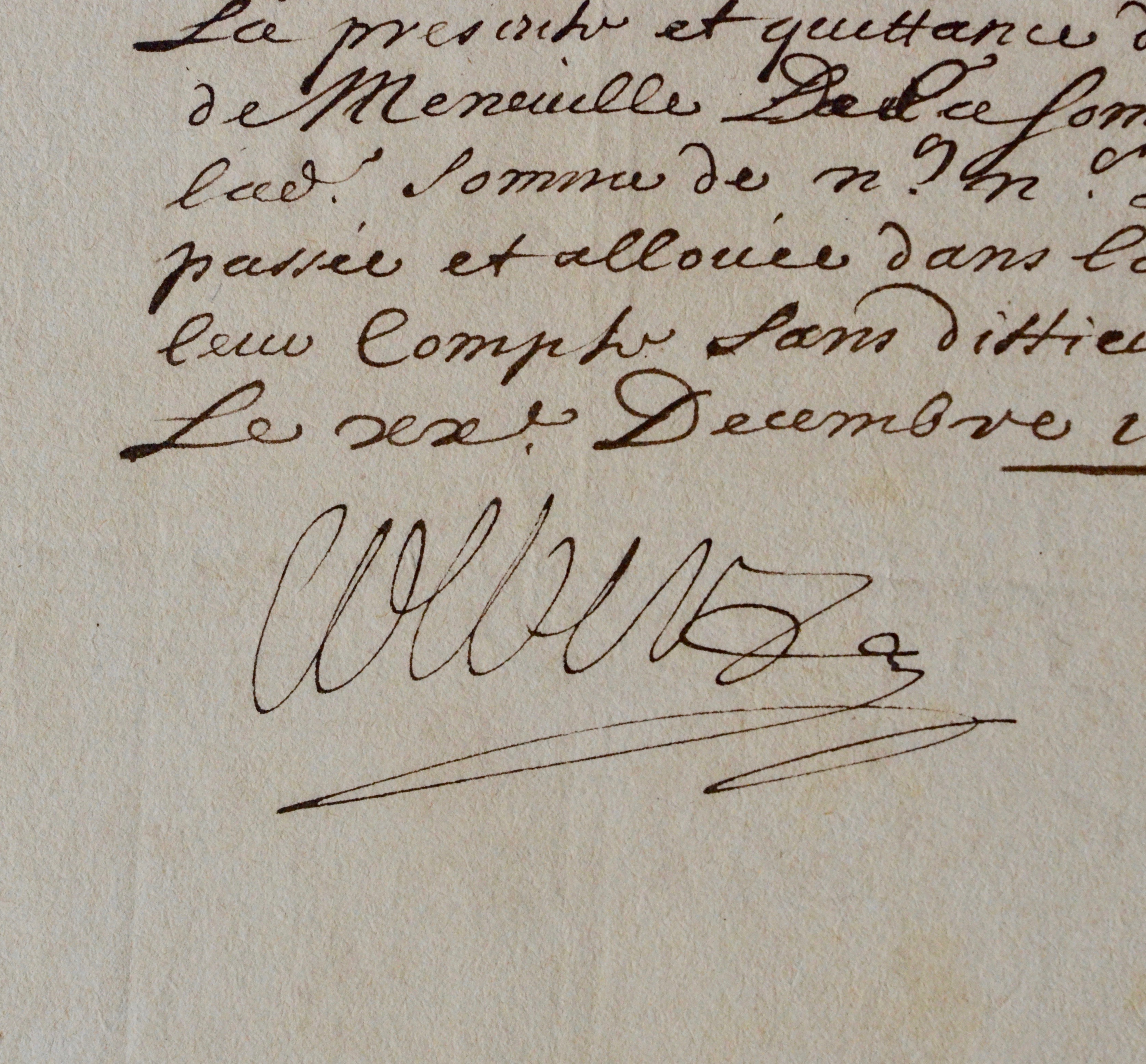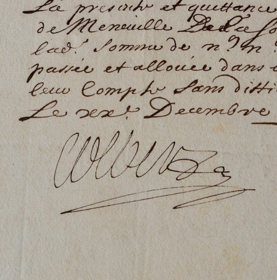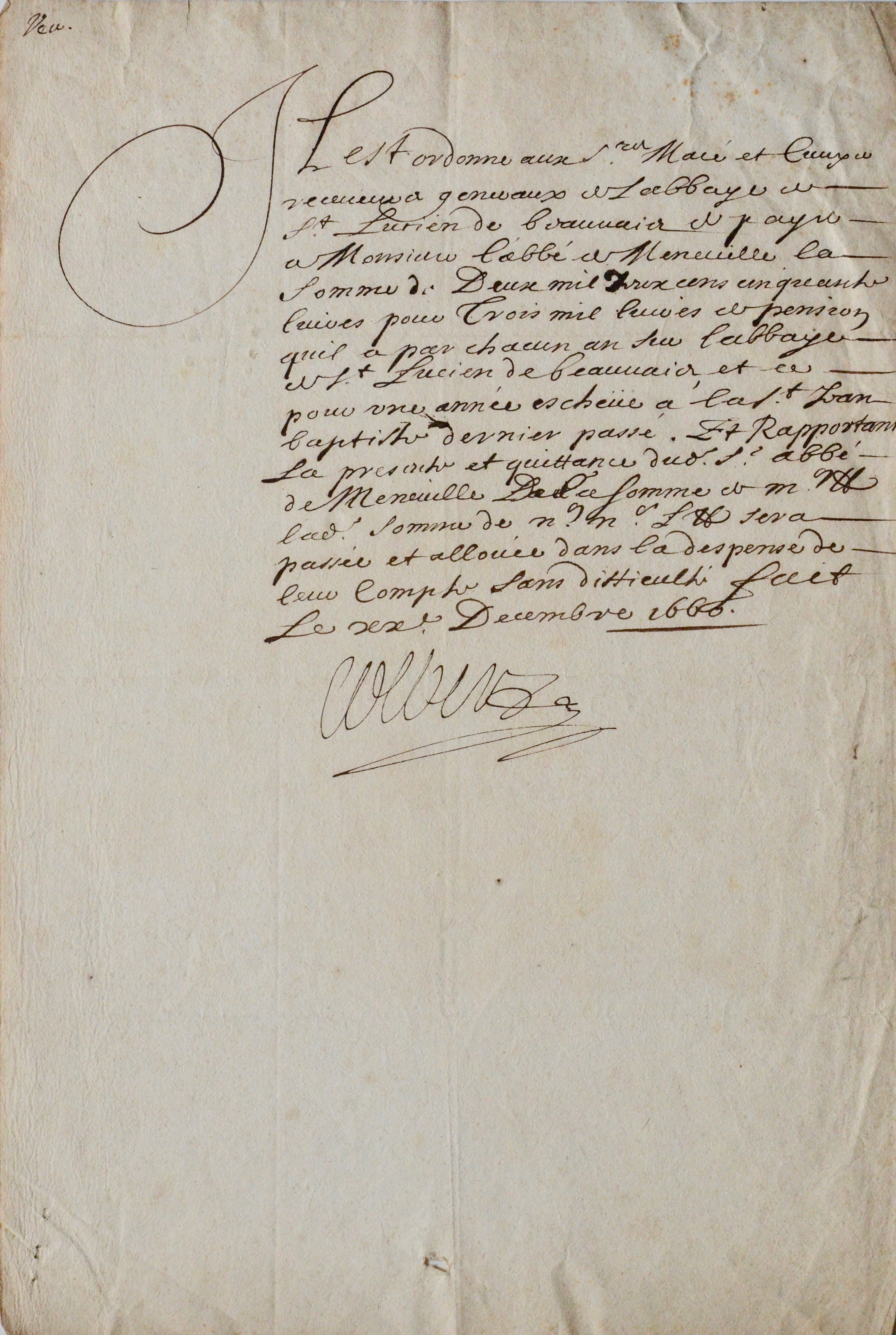 Ordre aux receveurs généraux de l'abbaye de Saint-Lucien de Beauvais, de payer la pension de l'Abbé de Meneuille, soit la somme de 2350 livres sur les 3000 livres de pension annuelle qu'il a sur cette abbaye. Belle signature de Colbert de Croissy.