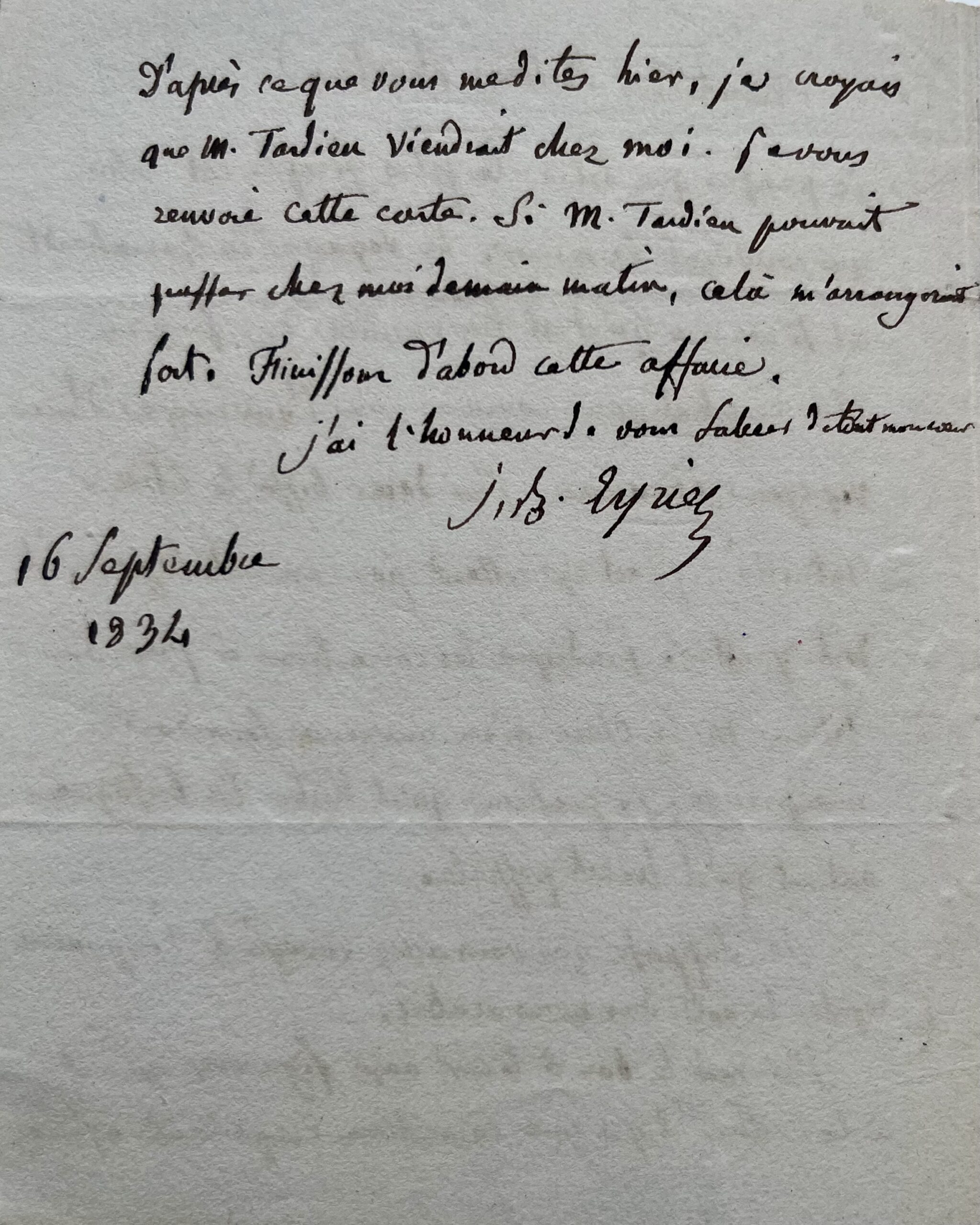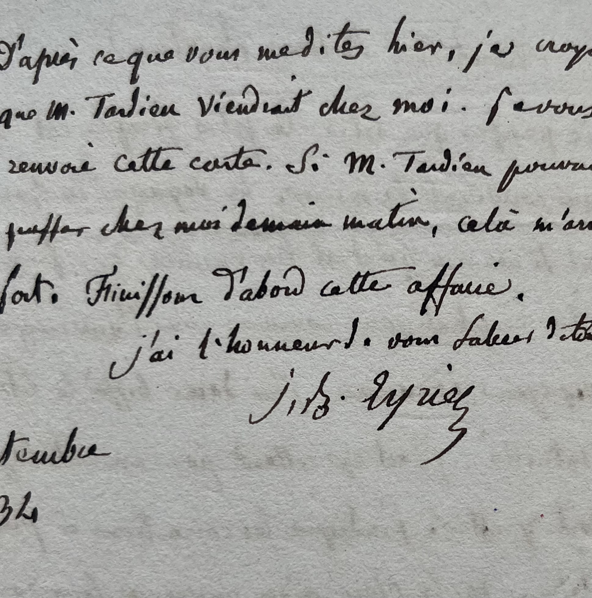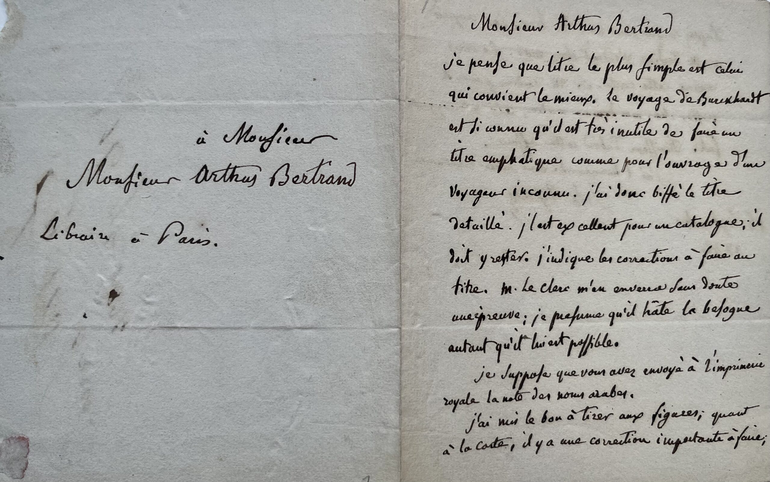 Jean-Baptiste Eyriès (Marseille, 1767/1846)"Je pense que le titre le plus simple est celui qui convient le mieux. Le Voyage de Burckhardt est si connu qu'il est très inutile de faire un titre emphatique comme pour l'ouvrage d'un voyageur inconnu. J'ai donc biffé le titre détaillé. Il est excellent pour un catalogue ; il doit y rester. J'indique les corrections à faire au titre. M. Le Clerc m'en enverra sans doute une épreuve ; je présume qu'il hâte la besogne autant qu'il lui est possible. Je suppose que vous avez envoyé à l'imprimerie royale la note des noms arabes. J'ai mis le bon à tirer aux figures ; quant à la carte, il y a une correction importante à faire. D'après ce que vous me dites hier, je croyais que M. Tardieu [le cartographe et graveur Ambroise Tardieu ()] viendrait chez moi. Je vous renvoie cette carte. Si M. Tardieu pouvait passer chez moi demain matin, cela m'arrangerait fort. Finissons d'abord cette affaire".