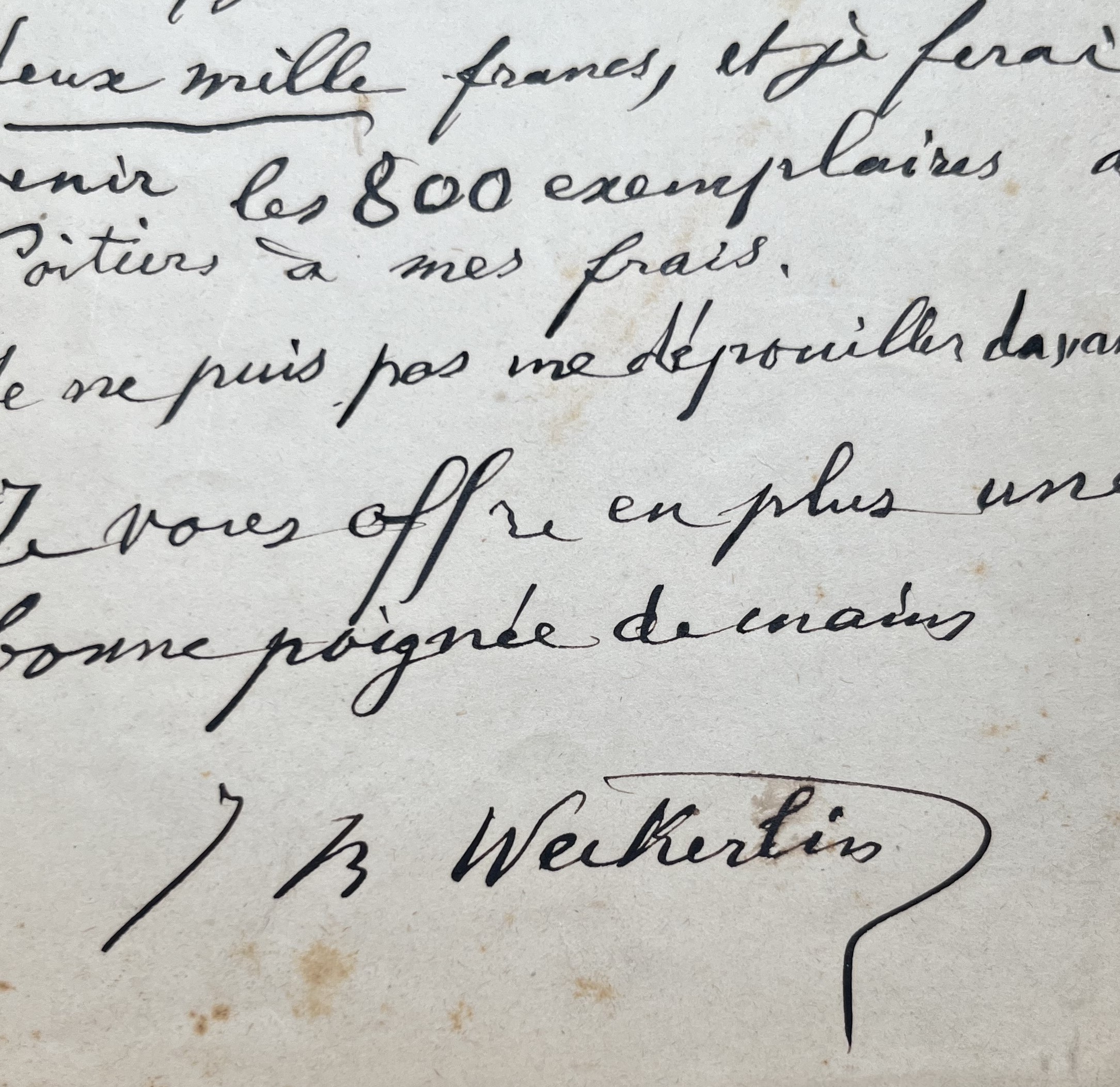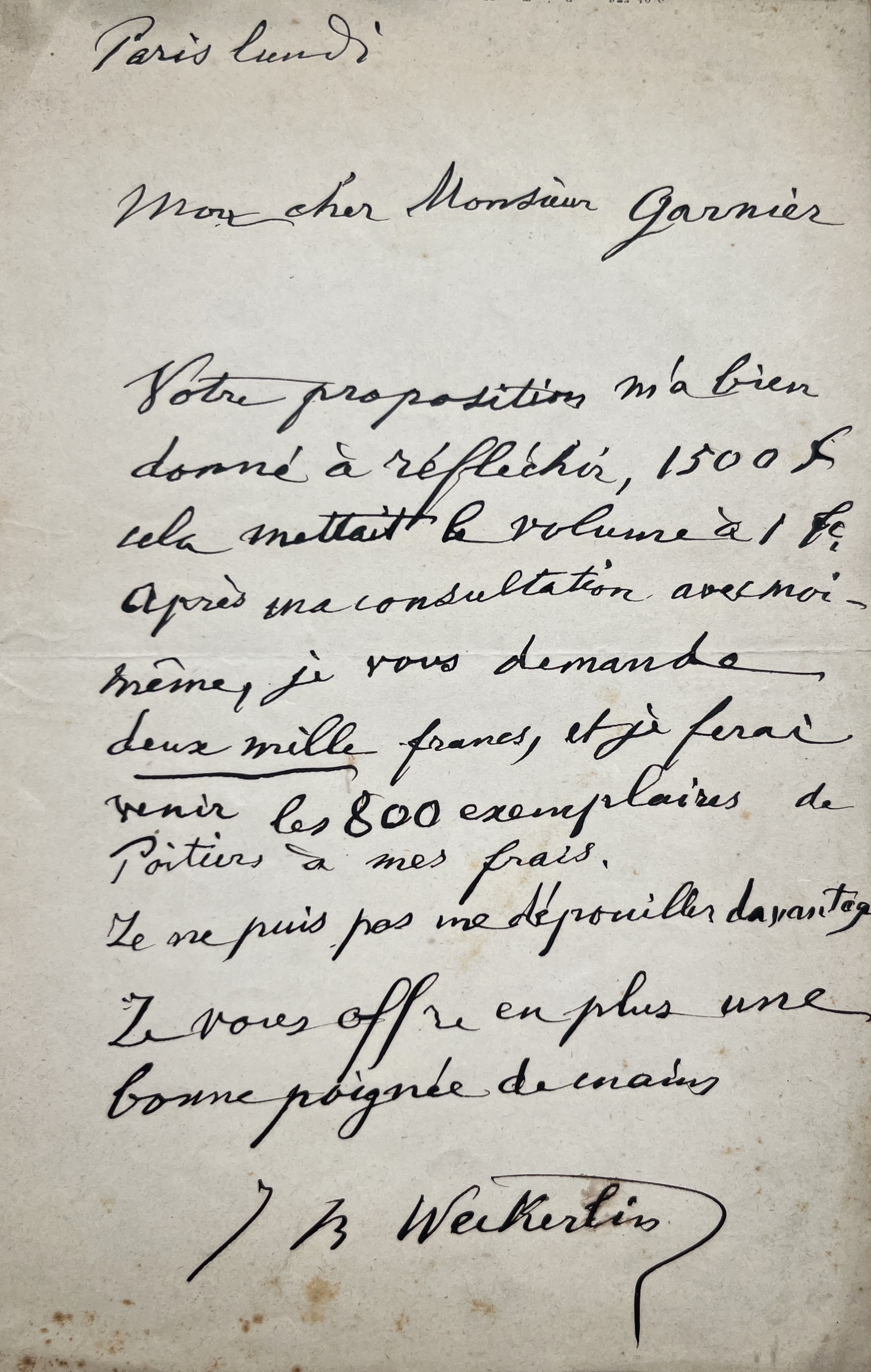 "Votre proposition m'a bien donné à réfléchir, 1500f cela mettrait le volume à 1f après une consultation avec moi-même, je vous demande deux mille francs, et je ferai venir les 800 exemplaires de Poitiers à mes frais. Je ne puis pas me dépouiller davantage. Je vous offre en plus une bonne poignée de mains".