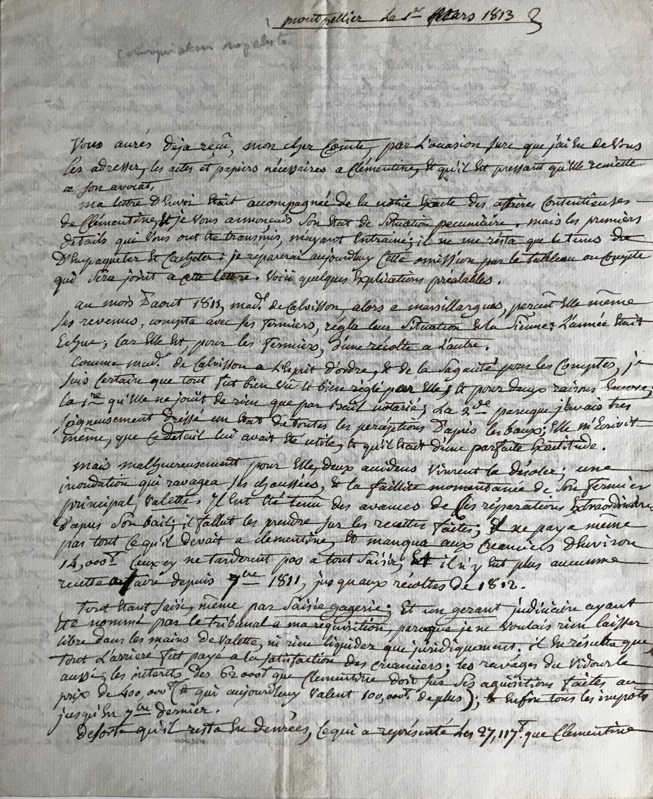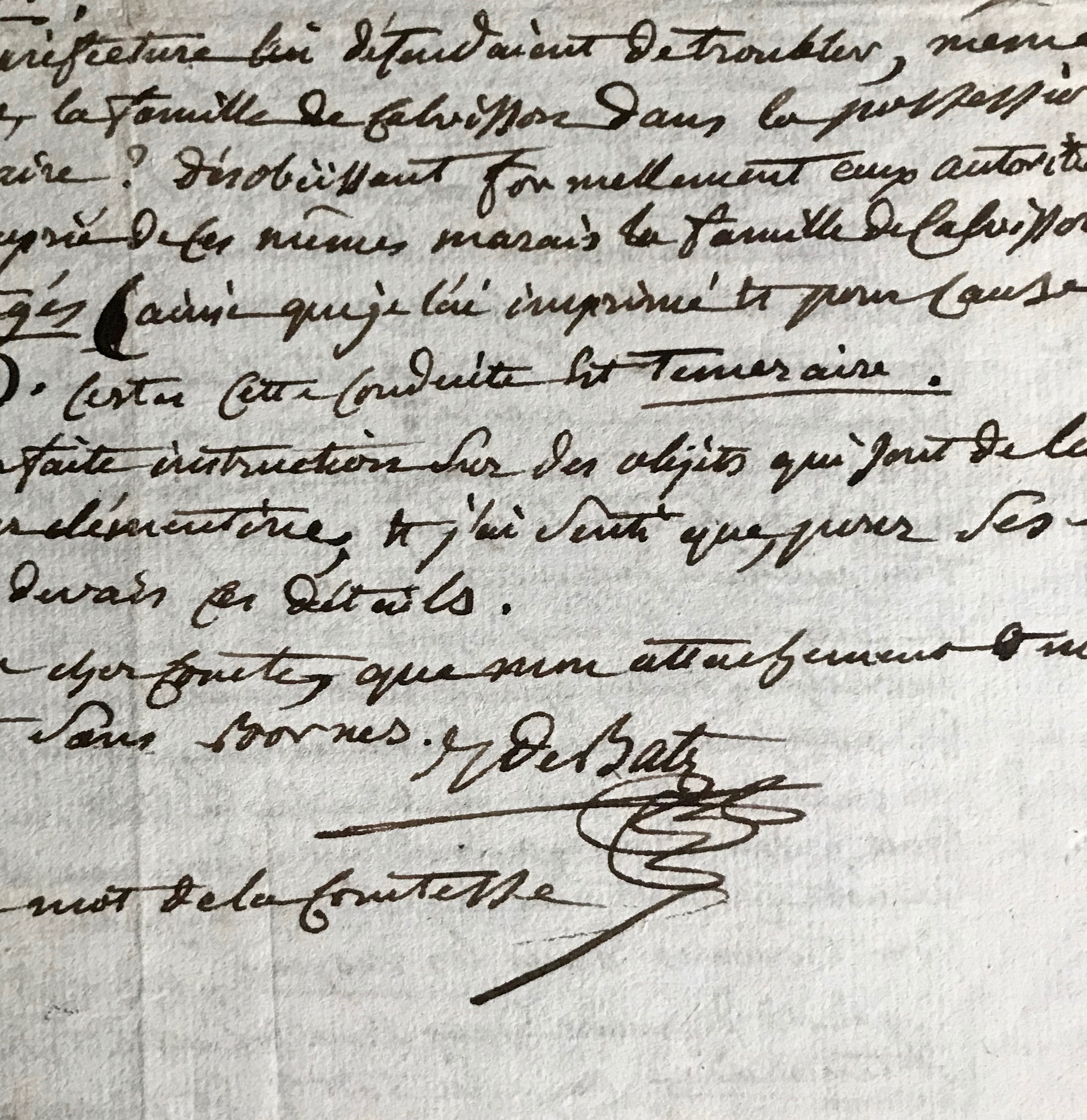 Jean de Batz (Tartas, 1754/1822)Longue lettre de Jean de Batz, à son « cher comte ». Le financier, ancien comploteur royaliste, parle de la fortune d'une famille noble qu'il cherche à restaurer au lendemain de la Révolution : « [...] Je suis ici sur la brèche, j'y présente un spectacle tout neuf, de défendre la fortune de la famille de Calvisson ; et d'en arracher quelques débris à des spoliateurs très opiniâtres, très habiles, et trop protégés. Je vous ai transmis par M. de La Valette le nom des marques, leurs affections, leurs secrets intérêts ou calculs ; ce sont les sources de leur imposture. Mais on ne m'arrête pas ainsi ; je suis à présent trop près du but pour reculer [...] ». Il évoque à maintes reprises Clémentine et son futur mariage, ainsi que M. de Narbonne, M. Danglas, etc.