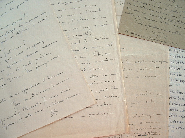 Jean Bosschère (de) (Bruxelles, 1878/1953)Belle correspondance du "paria des lettres françaises", ami de Joyce et d'Artaud, Jean de Bosschère. 1933, sur le monde littéraire et de l'édition. «Quant à la plainte, il me semble qu'il n'était pas nécessaire de m'insulter publiquement. Un grand nombre de personnes sont, je le sais, au courant du projet de S.N. Si la revue reparaît, j'estimerais que l'insulte est volontaire ; ce n'est pas une gaminerie. On ne peut pas chercher dans sa solitude un aîné pour le trahir publiquement de cette façon. Si elle ne reparaît plus, l'aventure rejoindra les autres, parmi lesquelles d'incroyables, mais dont la réalité est appuyée par les lettres. Si la fantaisie qui me possède actuellement me demeure, un jour je ferai de tout cela quelques pages pour servir à l'étude secrète du coeur des poètes (deux ou trois) qui, pour séduire les jeunes, ont mis un peu de surréalisme dans leurs petites crottes de bourgeois fortunés [...]». Il invite Hubert Dubois à venir disserter avec lui, en particulier au sujet de son "Elskamp l'Admirable", lui propose de réaliser le fronstispice de son prochain recueil de poèmes. «Je dessine très peu aujourd'hui, mais pour vous je prendrais avec le plus grand plaisir mes crayons à leur sommeil. Je veux dire que je les tirerais à nouveau du repos que je viens d'interrompre pour faire les trente portraits dont vous eussiez dû être si j'avais eu le plaisir de vous voir». Il disserte aussi sur la pureté «d'une rareté angoissante» même chez les poètes, et évoque Elskamp, son ami de toujours. «En réalité, je ne puis plus, au moins pendant un temps, parler d'Elskamp. On me laisse trop seul avec lui. J'attends [...]».