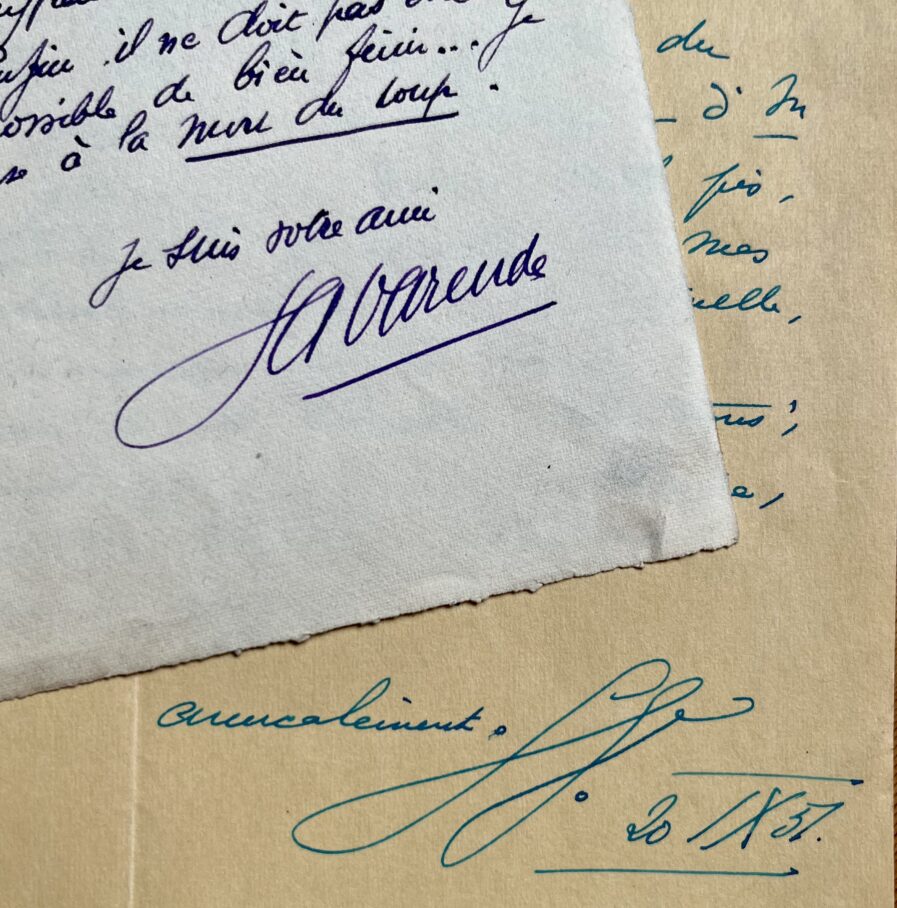 Enveloppes autographes conservées. Encre violette et turquoise.