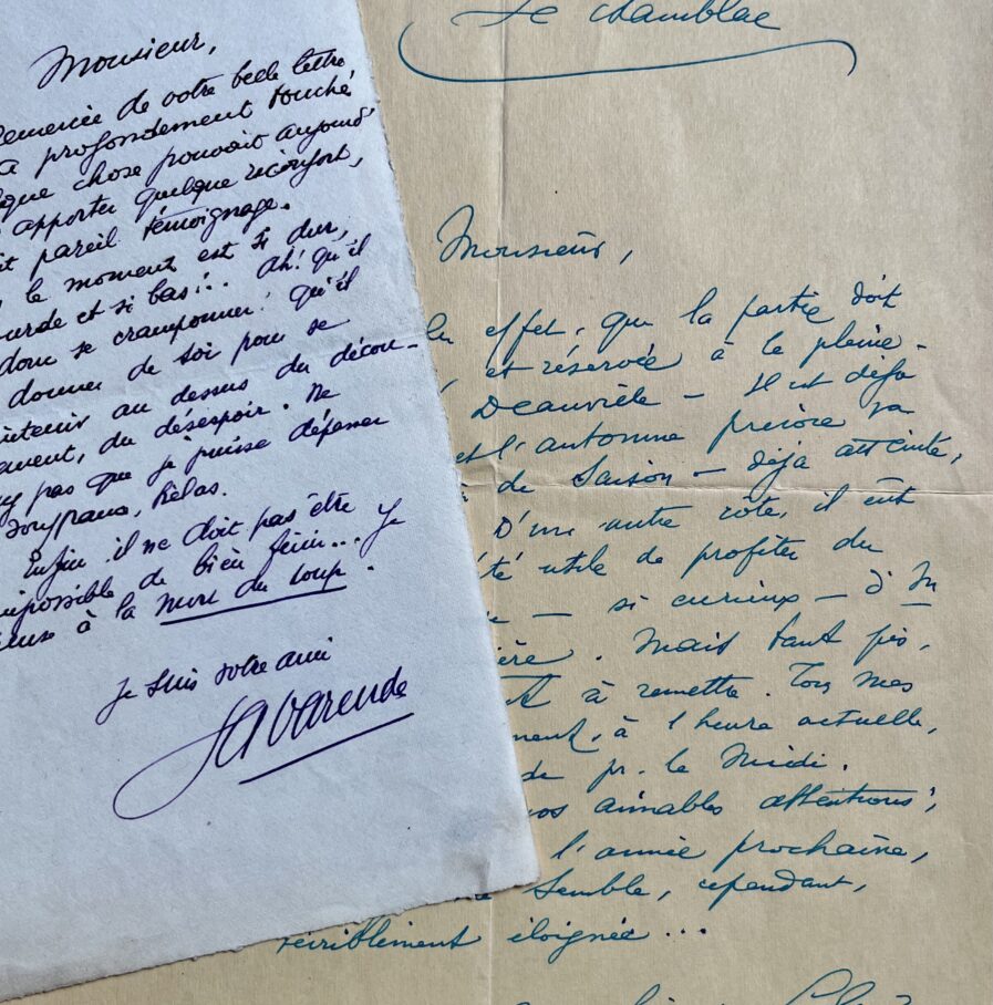 2 lettres de Jean de La Varende, à son ami Jean de Fleury, écrites à la fin de sa vie.