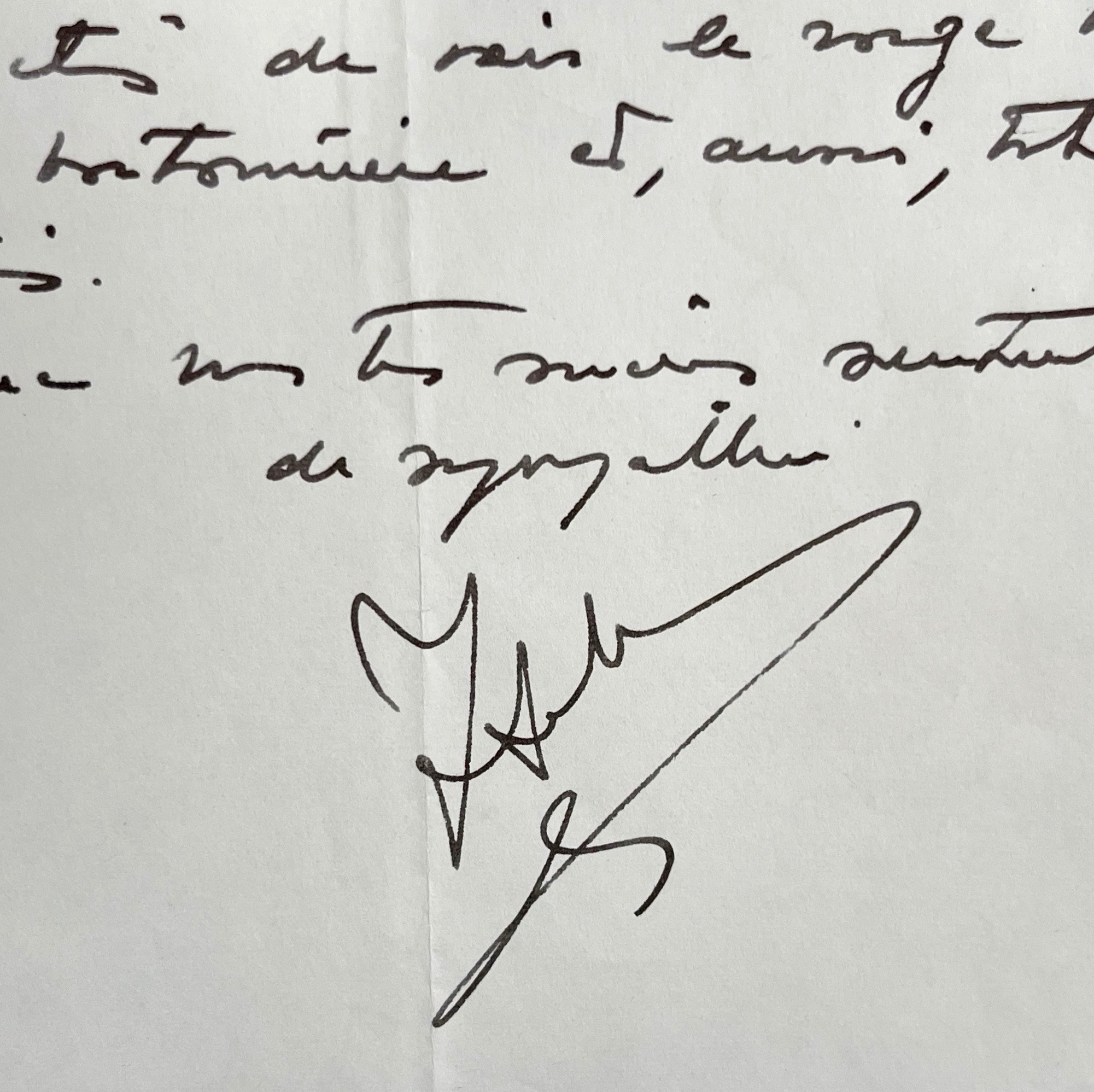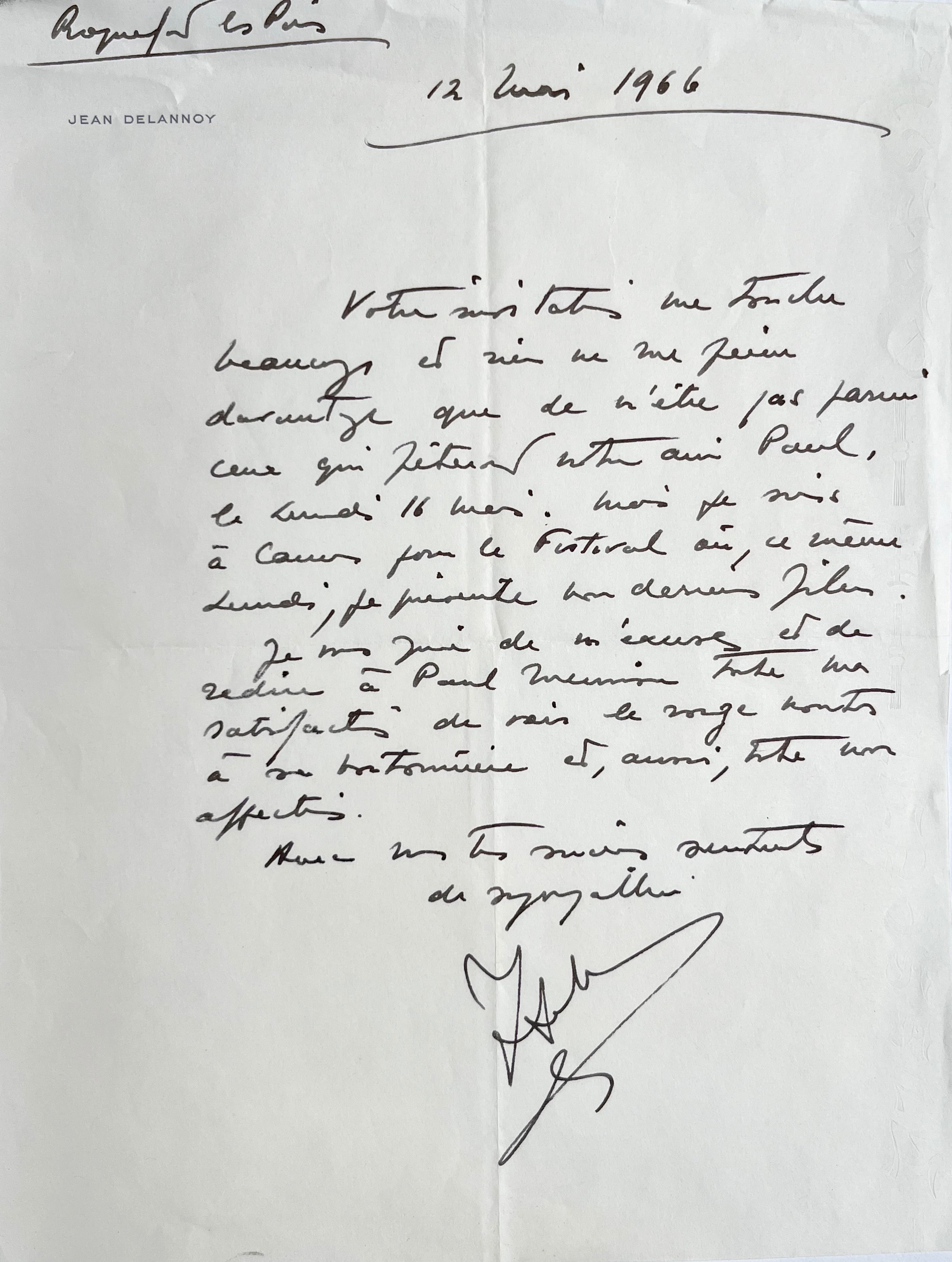 "Votre invitation me touche beaucoup et rien ne me peine davantage que de n'être pas parmi ceux qui fêtent notre ami Paul [...]. Mais je suis à Cannes pour le festival où, ce même lundi, je présente mon dernier film [Les Sultans, avec Gina Lollobrigida]. Je vous prie de m'excuser et de redire à Paul Meurisse toute ma satisfaction de voir le rouge bouton à sa boutonnière et, aussi, toute mon affection".