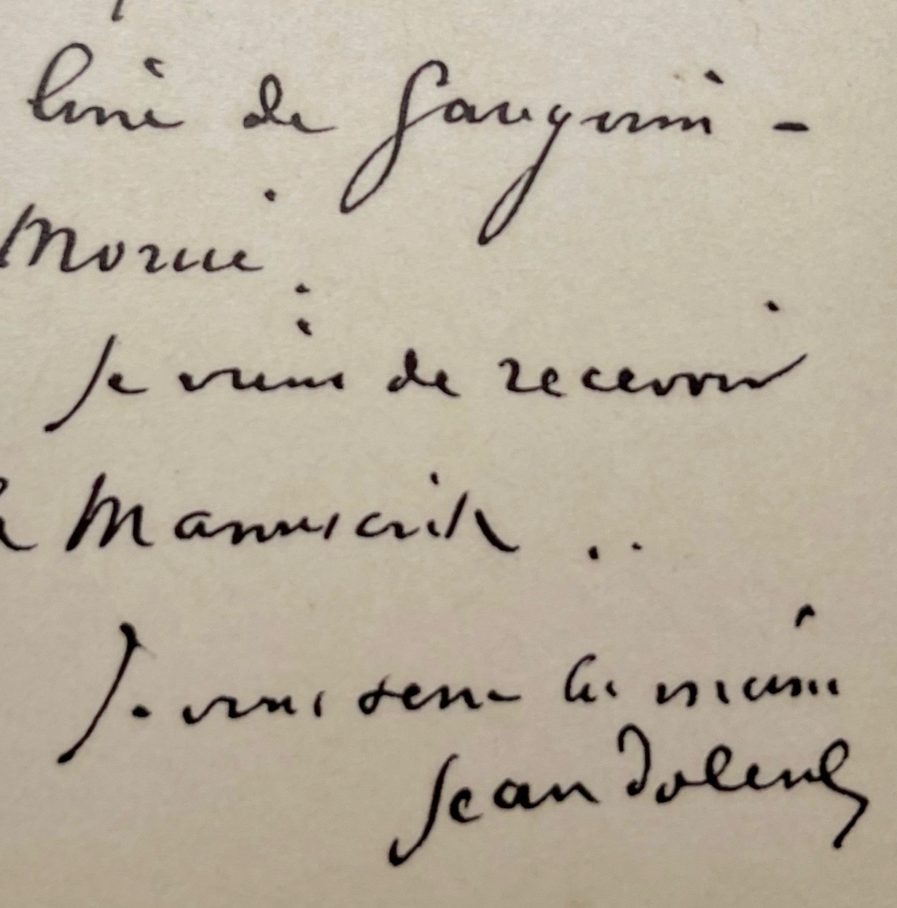 "Mon cher Geffroy. M. Fasquelle m'écrit ne pouvoir éditer le livre de Gauguin - Morice. Je viens de recevoir le manuscrit... Je vous serre la main. Jean Dolent".
