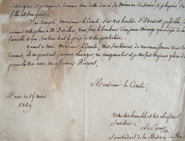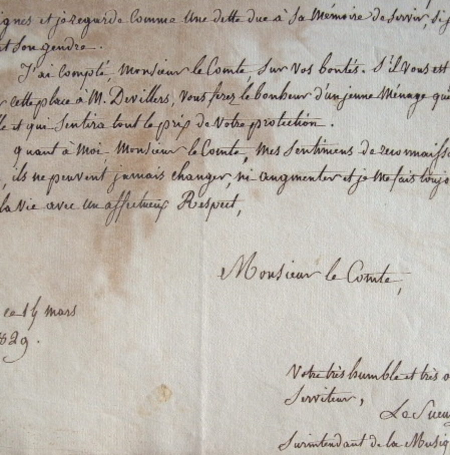 Le Sueur soutient la candidature du maître de chapelle de Notre-Dame, à l'administration du Mont de Piété. «J'avais beaucoup d'amitié pour Desvignes et je regarde comme une dette due à sa mémoire de servir, si je le puis, sa fille et son gendre [...]».