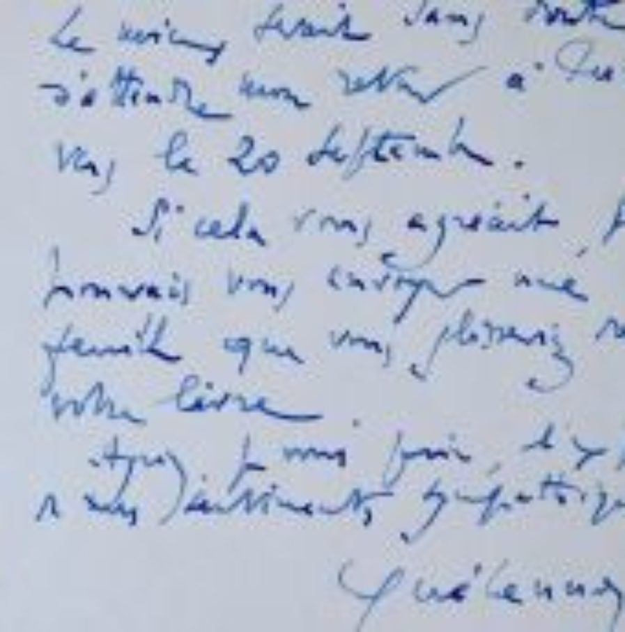 « Je vous remercie de votre lettre et c'est bien volontiers que je dédicacerai pour vous les livres que vous souhaitez. [...] ». Cependant, il demande d'attendre son retour à Paris. "Si cela vous agréait, je pourrais vous envoyer une feuille que vous glisseriez dans votre livre [...]".