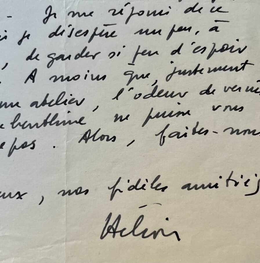 "Vos fleurs bleues ont égayé et enrichi notre été. Je me sentirais coupable de ne pas encore vous avoir remercié de l'envoi de votre livre si je n'avais lu dans la presse plusieurs textes qui lui renvoient justice. Celui de Jouffroy, entre autres. Je me réjouis de ce succès, mais je désespère un peu, à cause de lui, de garder si peu d'espoir de vous voir. A moins que, justement le calme d'un atelier, l'odeur de vernis et de la térébenthine ne puisse vous paraître un repos. Alors, faites-moi signe. À tous deux, mes fidèles amitiés. Hélion".