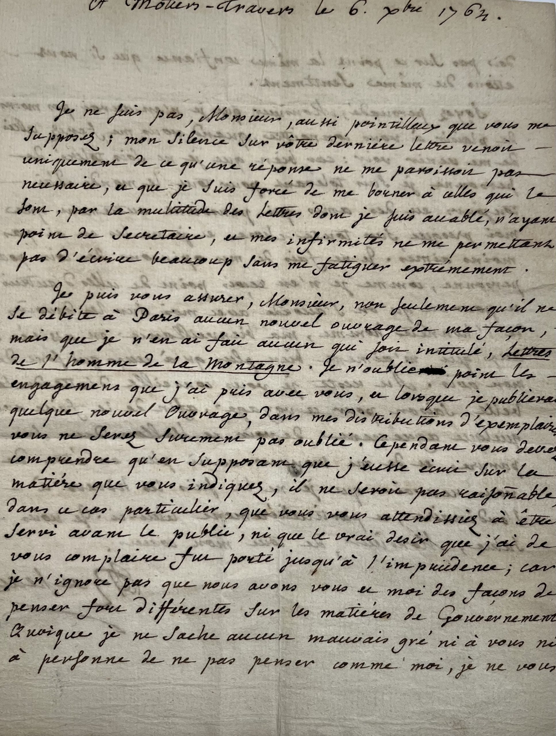 Rousseau se plaint de l'absence de secrétaire ne lui permettant pas de répondre à "la multitude de lettres" qu'il reçoit, avant de mentir à son interlocuteur : "je puis vous assurer, Monsieur, non seulement qu'il ne se débite à Paris aucun nouvel ouvrage de ma façon, mais que je n'en ai fait aucun qui soit intitulé, Lettres de l'homme de la montagne. Je n'oublie point les engagements que j'ai pris avec vous, et lorsque je publierai quelque nouvel ouvrage, dans mes distributions d'exemplaires vous ne serez surement pas oublié."