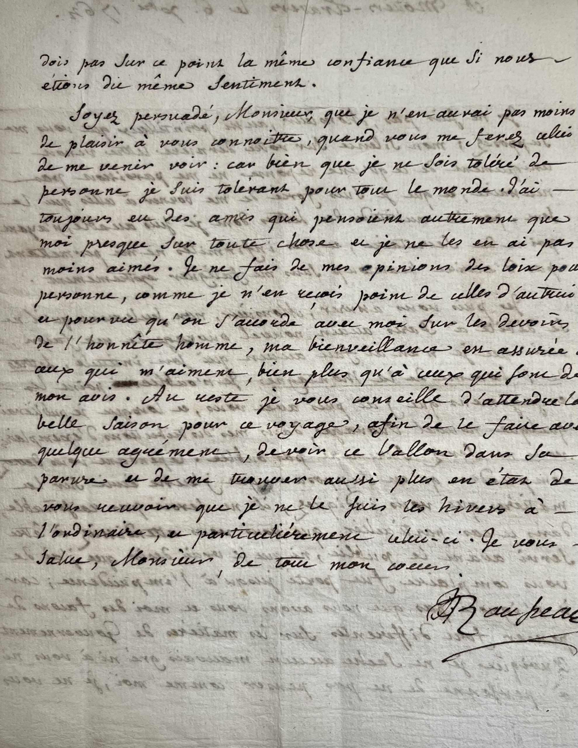 Malgré leurs différends, il sollicite une visite de son correspondant dans sa ville d'exil : "Soyez persuadé, Monsieur, que je n'en aurai pas moins de plaisir à vous connoitre, quand vous me ferez celui de me venir voir", ironisant ensuite sur le nombre de ses détracteurs et sa bienveillance à toute épreuve : "bien que je ne sois toléré de personne je suis tolérant pour tout le monde. J'ai toujours eu des amis qui pensaient autrement que moi presque sur toute chose et je ne les ai pas moins aimés. Je ne fais de mes opinions des loix pour personne, comme je n'en reçois point de celles d'autrui, et pourvu qu'on s'accorde avec moi sur les devoirs de l'honnête homme, ma bienveillance est assurée à ceux qui m'aiment, bien plus qu'à ceux qui sont de mon avis [...]".