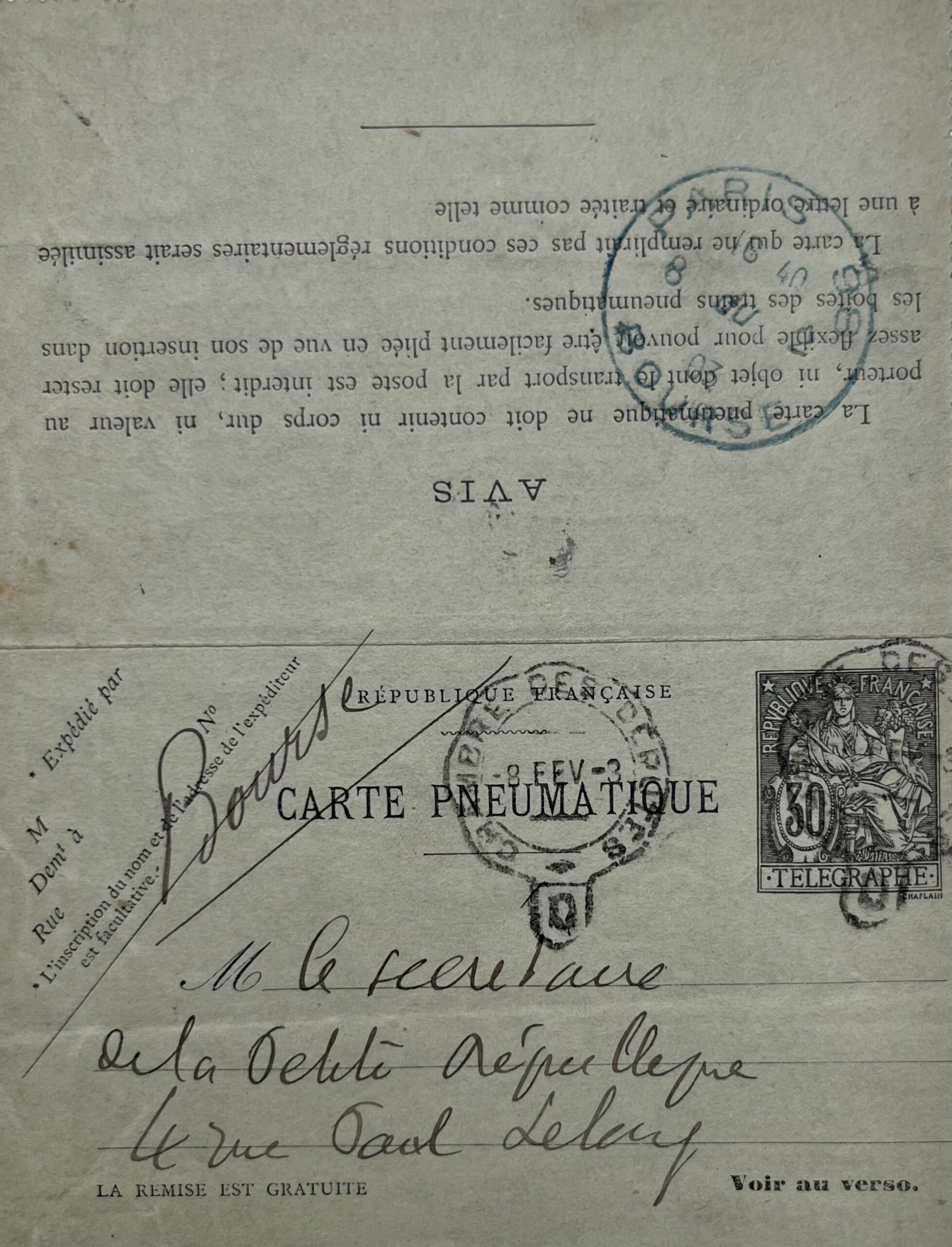 Ecrite sur "carte pneumatique" avec adresse au dos et cachets postaux de la Chambre des Députés.