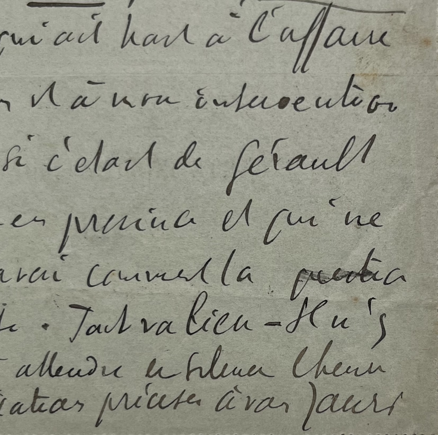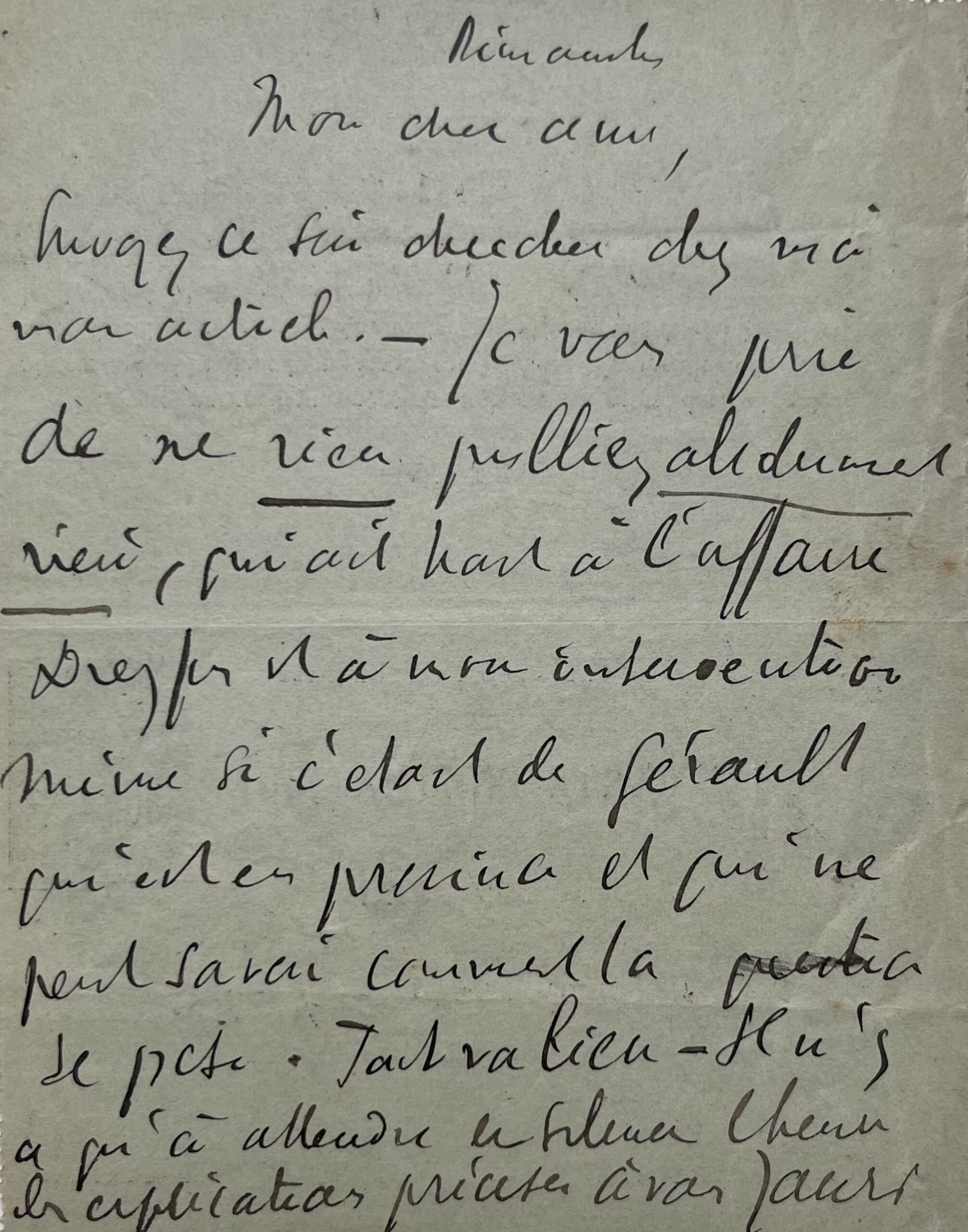 "Envoyez ce soir chercher chez moi mon article. Je vous prie de ne rien publier absolument rien qui ait part à l'affaire Dreyfus et à mon intervention même si c'était de Gérault-[Richard] qui est en province et qui ne peut savoir comment la question se pose. Tout va bien. Il n'y a qu'à attendre en silence. Chercher des explications précises. A vous. Jaurès".