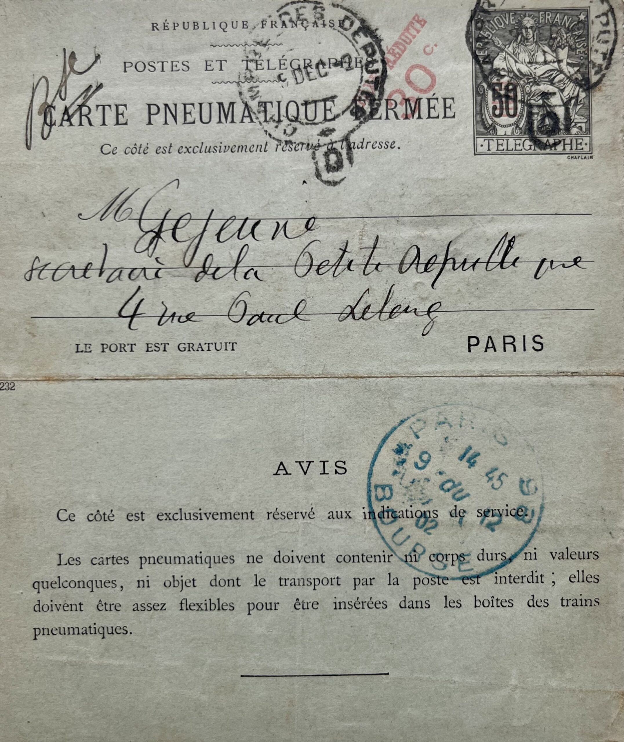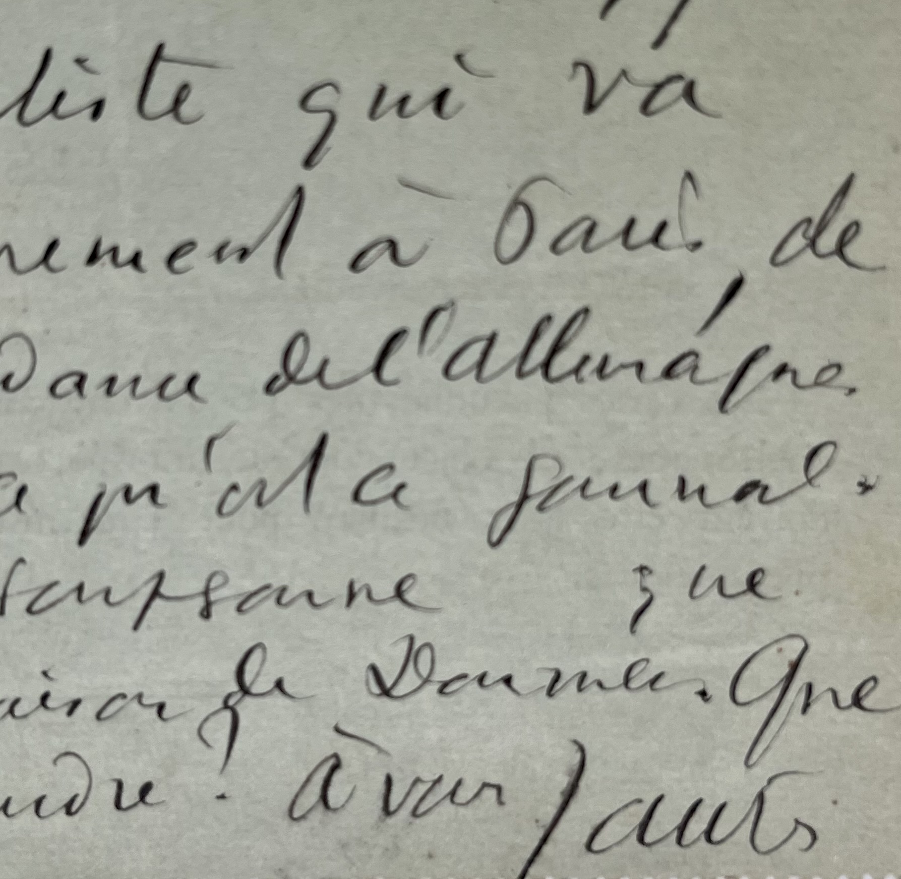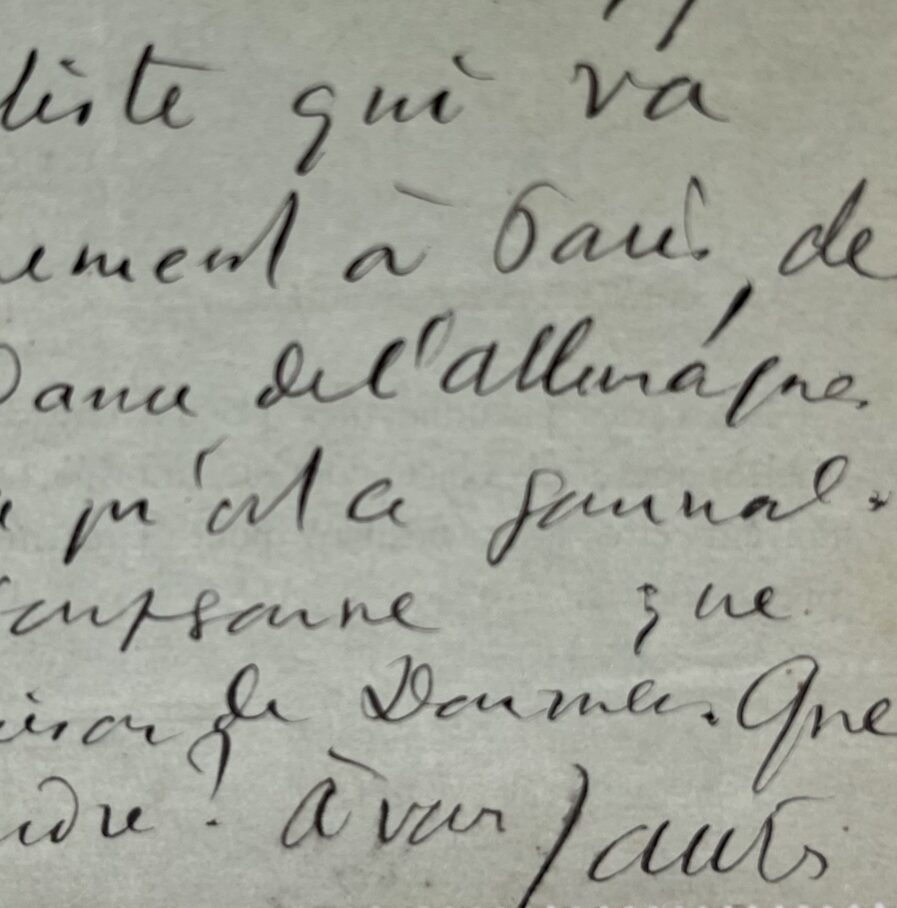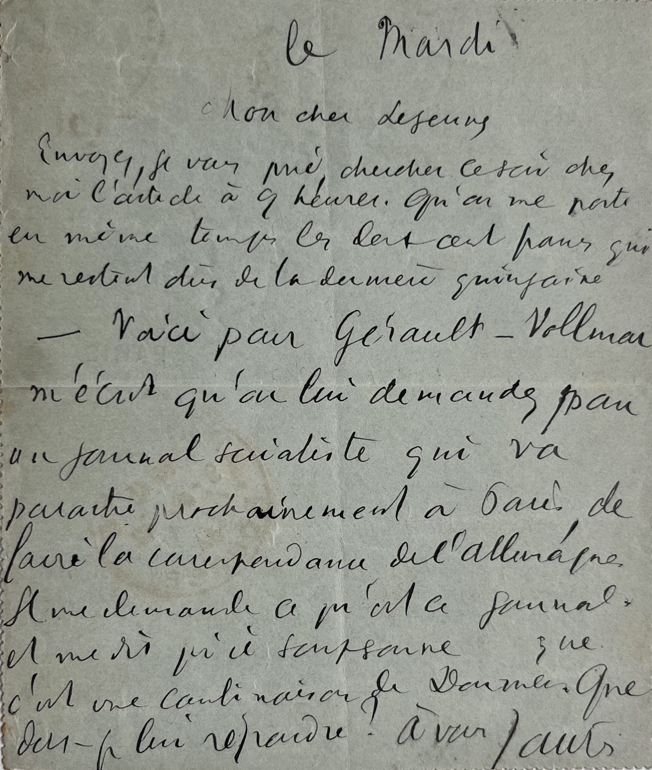 Jean Jaurès (Castres, 1859/1914)"Mon cher Lejeune. Envoyez, je vous prie chercher ce soir chez moi l'article à 9 heures. Qu'on me porte en même temps les deux cents francs qui me restent de la dernière quinzaine. Voici pour Gérault. Vollmar m'écrit qu'on lui demande pour un journal socialiste qui va paraître prochainement à Paris, de faire la correspondance de l'Allemagne. Il me demande ce qu'est ce journal et me dit qu'il soupçonne que c'est une combinaison de Doumer. Que dois-je lui répondre? A vous. Jaurès".